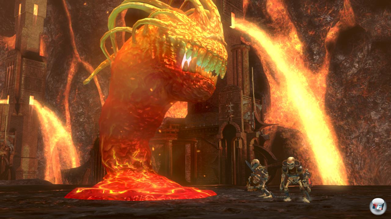 Hier trifft eine Horde lebensmüder Skelette auf ein riesiges Lavamonster: Wenn man dem Ungetüm vorher gut zugesetzt hat, haben vielleicht auch die Knochenmänner eine Chance…