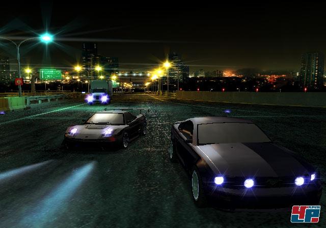 Aber zurück zu unterhaltsameren Elementen des Spiels, zurück an die Startlinie: Ist der Countdown bei Null angelangt, presst ihr den frei konfigurierbaren Gasknopf so doll es geht in den Controller und gebt Gummi. Am besten löst ihr zum Start auch gleich den Nitro aus, um euch sofort vor euren Gegner zu setzen und genießt das grandiose Geschwindigkeitsgefühl. Die glitzernde Großstadt saust dank virtuellen Tunnelblick blitzschnell an euch vorbei und sowohl eure Sicht als auch der Controller beginnen zu vibrieren. Die Umgebung spiegelt sich dank einem erstaunlich flüssigen Environment-Mapping auf dem Lack wieder. Das realistische Röhren der Motoren tut sein Übriges dazu, dass man sich mitten ins Rennen versetzt fühlt. Dank der flotten Musik aus Genres wie Drum’n’Bass und J-Rock wird der Adrenalinpegel noch erhöht. Leider erinnern die nicht gerade seltenen Ruckler euch daran, dass ihr vor einer Konsole sitzt. Auch die kargen Hintergründe sorgen nicht gerade für Begeisterungsstürme. Mehr als unscharf texturierte Hochhäuser bekommt ihr nicht zu Gesicht. Und die Fahrzeuge sind auch lange nicht so detailliert modelliert wie in einem Gran Turismo.