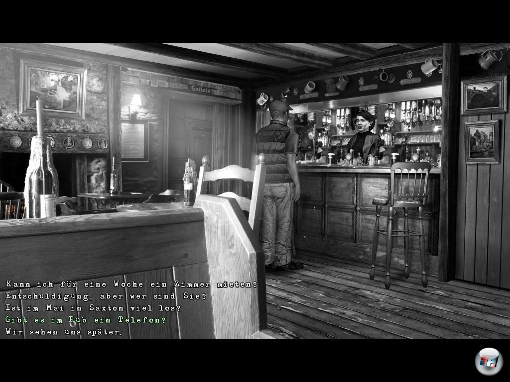 Nachdem Nigel von der Eisenbahn quasi im Moor ausgesetzt wurde, da die Strecke überschwemmt ist, kämpft er sich einsam durchs Schilf, das hier „Fenns“ heißt. Allein von der Hoffnung getrieben, irgendwann an eine Behausung zu kommen, wie es ihm der Stationsvorsteher geraten hat. Das gelingt ihm schließlich auch, nachdem er zuvor noch durch eine klamme Höhle gekraxelt ist, die bei Flut überschwemmt wird. Alles ziemlich mysteriös, wie etwa die traurige Frau mit Hund, die er am Strand trifft und die ihn zu kennen scheint – dabei war er doch noch nie hier! Als Nigel das nebelumwaberte Saxton betritt, freut er sich zwar, dass er angekommen ist, aber irgendwie scheinen die Bewohner nicht von dieser Welt zu sein: In dem Fischerdorf ist die Zeit stehen geblieben, denn hier sehen die Telefone aus wie vor 50 Jahren und die Eisenbahn wie vor 100. Alles wirkt antik und die Grafik unterstreicht das Gefühl der Zeitreise, denn nahezu alles erscheint in Schwarz-Weiß – Farbtupfer wie Blumen sind selten. Die Leute, die er trifft, scheinen schon ewig dort zu wohnen. Oder aber es sind Schatzsucher, die dem Mythos der verlorenen Krone hinterher jagen.