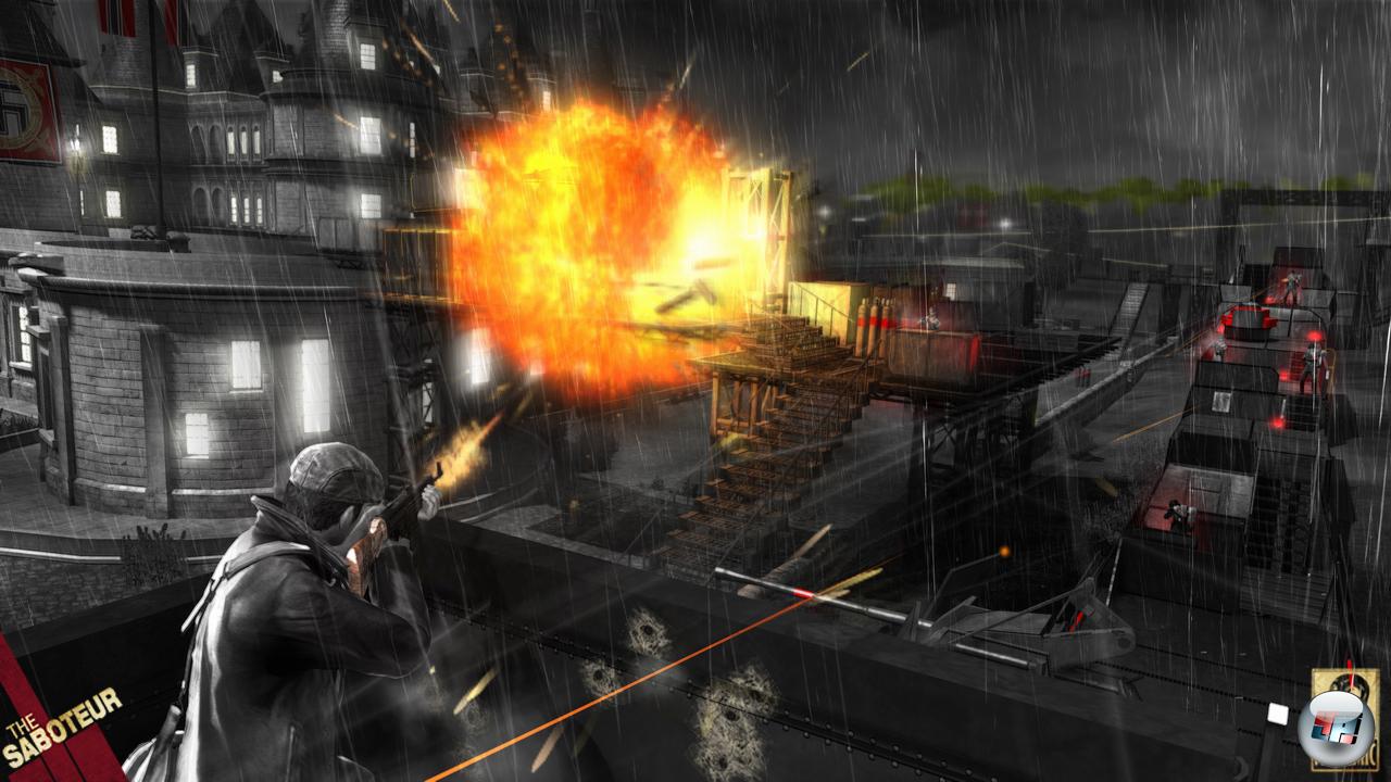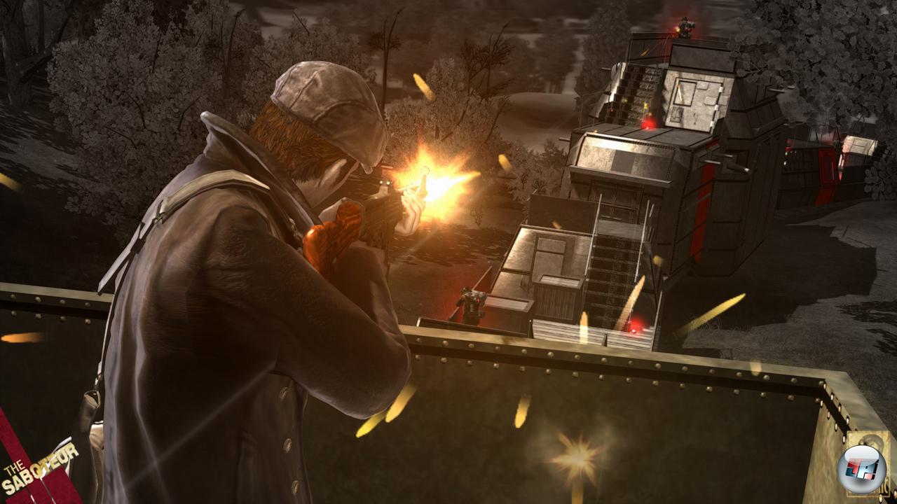 …ohne dass es einen juckt. Das mache ich schon eine ganze Weile, weil es so leicht ist. Saboteur bietet auf den ersten Blick mit seinen Alarmstufen, die sich, falls man ihrem Umkreis nicht entkommt, in ihrer Intensität steigern und immer mehr sowie schwerer bewaffnete Truppen nach sich ziehen, ein solides Fundament. Aber das stürzt nicht irgendwann ein mal, sondern immer wieder komplett in sich zusammen. Deshalb stehe ich jetzt auch zum hunderteinundzwanzigsten Mal relativ relaxt auf einem Dach (hier im Video). Um mich herum jaulen natürlich die Alarmsirenen. Unter mir stehen auch schon die ersten Jäger in ihren graugrünen Uniformen und zücken ihre Gewehre. Eigentlich müsste ich jetzt Panik oder wenigstens etwas Angst bekommen, denn ich bin hier oben gut sichtbar und alleine unterwegs. Außerdem rufen diese fünf Landser bereits Verstärkung! Ich hätte den Typen mit der Trillerpfeife zwar töten können, um dem vorzubeugen, aber warum? Diese Deutschen sind zwar trotz meiner Anschläge noch in der bewaffneten Überzahl, aber das ist mir schnurzpiepegal.