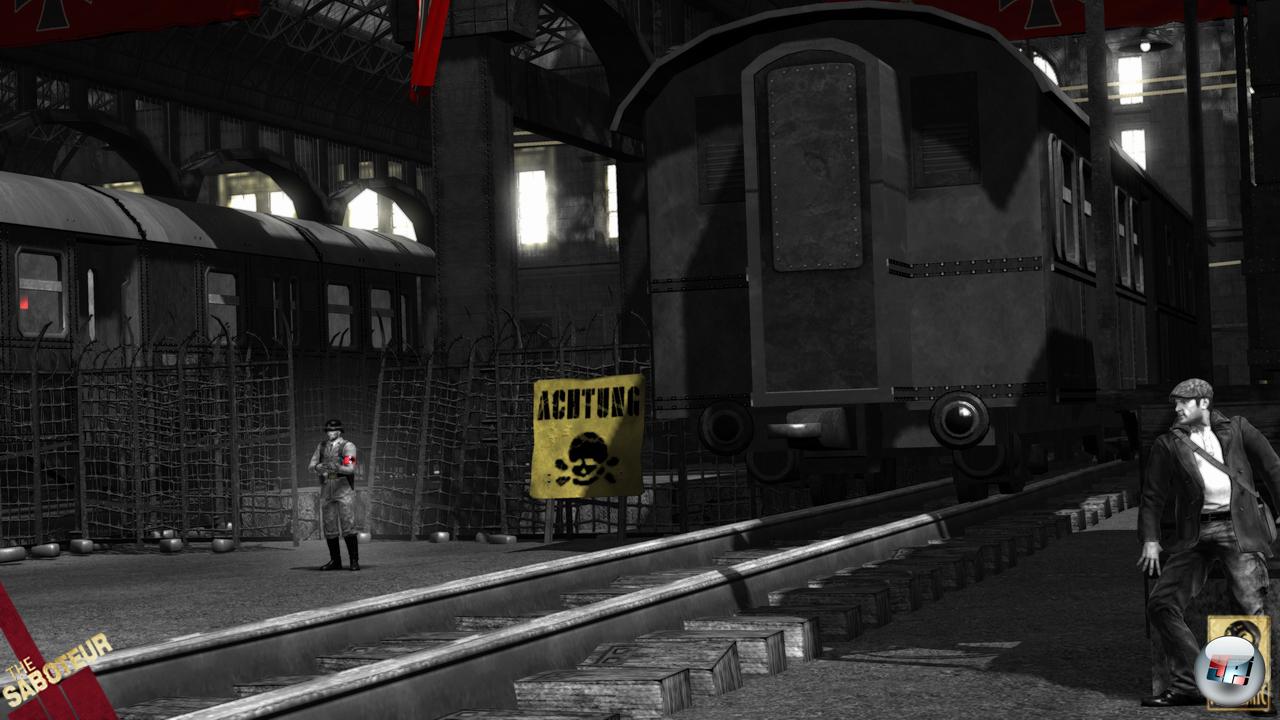 Reden wir über die guten Seiten, nicht dass die noch komplett untergehen, weil es weder ein glaubwürdiges Figurenverhalten noch spürbare Konsequenzen gibt. Dieses Spiel hat durchaus einige interessante und motivierende Ansätze, die mich trotz dieser Katastrophen einige Zeit unterhalten haben. Da ist z.B. die Verdachtsanzeige, die mir darüber Auskunft gibt, wann die Deutschen mich auf dem Kieker haben – so kann ich quasi kurz vor dem Pfiff einem Alarm entgehen. Dass der aufgrund blöder Landser keine Panik auslöst, entwertet diese Idee zwar wieder, aber das System wird gut umgesetzt: Wenn ich einfach so schleiche oder an Fassaden hinauf klettere, die Waffen offen trage, deutsche Wagen ramme oder zu nah an besonders gesicherte Sperrgebiete komme, dann steigt die Anzeige nämlich. Erst wenn ich mit den verdächtigen Aktionen aufhöre, sinkt sie wieder.
