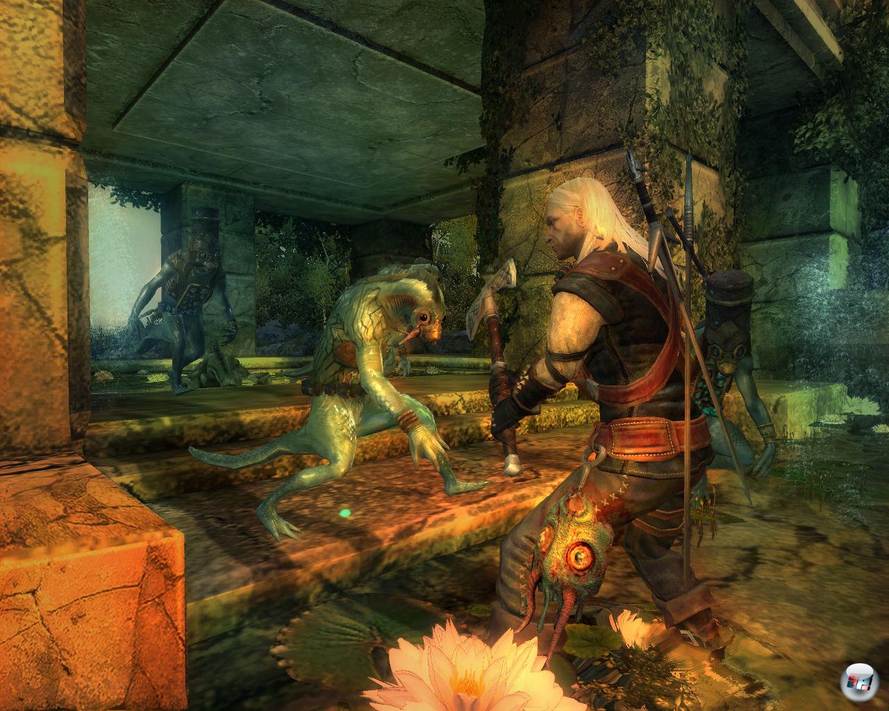 Das letzte Mal, dass ich trotz technischer Mängel so gut von einem Abenteuer unterhalten wurde, war im November 2004. Das Spiel hieß Vampire: Die Maskerade – Bloodlines <a class="DYNLINK" onmouseover="DynToolTipp_Show('Klicken für Gameinfos‚)“ onmouseout=“DynToolTipp_Hide(); “ href=“javascript:DynCont_Display(‚Gamefinder‘,’runmod.php?sid=%7BSID%7D&LAYOUT=dyncont_gf&spielid=4048′)“>. Aber man konnte sich diesem düsteren Trip einfach nicht entziehen. Genau so ist es mit dem Hexer: Das erstklassige Intro gibt nur einen kämpferischen Vorgeschmack auf die fünf spannenden Kapitel und das stilistische Können der polnischen Grafikabteilung. Kein Kitsch. Kein Kloppmist. Keine Katastrophe. Freut euch auf düstere Fantasy, in der neben Leder und Stahl vor allem Story, Charaktere und Atmosphäre dominieren. Auch wenn die Erzählung zu Beginn mehr Fragen aufwirft als Antworten gibt: Alles wird zu seiner Zeit aufgeklärt, selbst die Frage, wieso sich Geralt im Intro so lange mit dem Monster aufhält und erst die Fäuste anstatt die mächtige Waffe oder gleich Magie sprechen lässt.