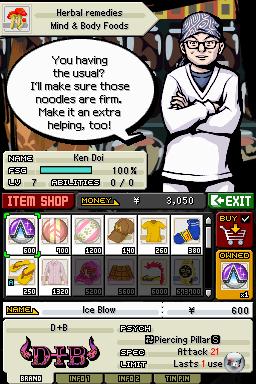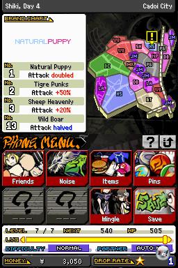 Für diese grafischen Feinheiten hat man zu Beginn kaum Zeit, denn man wird von einem einprägsamen Soundtrack, der je nach Viertel und Situation Hiphop, Dance oder Japan-Rock anbietet, in spannende Duelle getrieben. Irgendwann werden diese markanten Beats zu einem Ohrwurm, der selbst nach Tagen noch den DJ im Unterbewusstsein spielt – ich habe selten so eine Akustik am DS genossen. Am Anfang ist der Kampf noch sehr hektisch: Man muss die Attacken korrekt mit vertikalen oder horizontalen Hieben, mit schnellem Tippen oder Linien ausführen und bewegt sich dabei, indem man den Stylus in die entsprechende Richtung zieht – da kann man sich schon mal vertun. Außerdem wird gleichzeitig oben und unten gekämpft. Während man unten auf dem Touchscreen mit dem Stylus wirbelt, kann man über das Digikreuz den oberen Kampf beeinflussen. Das ist ein simultanes Kampfsystem, das es in sich hat und die ersten Ergebnisse fallen entsprechend schwach aus; Schulnoten bewerten eure Aktionen. Es lohnt sich allerdings, seine Skills zu verbessern.