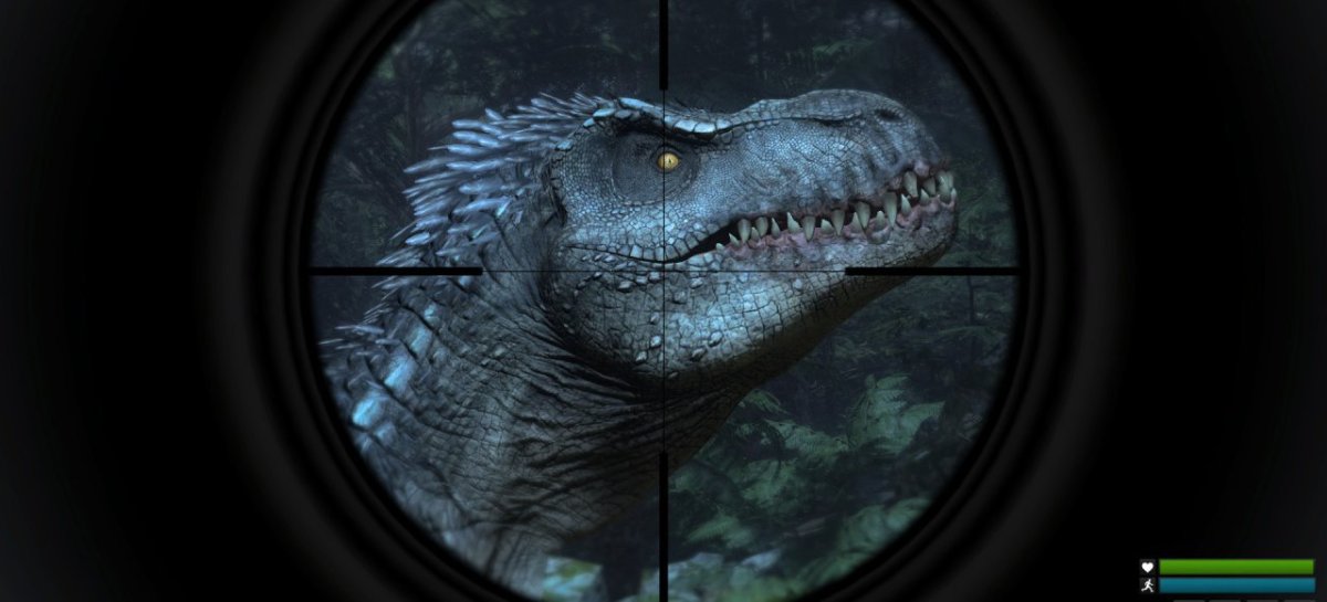 Ich wurde erstmal gebeten, nicht wie eine Dino-Scheuche in meinen leuchtend gelben Standard-Sträflingsanzug herumzulaufen. Als der Veteran mit Early-Access-Erfahrung bemerkte, dass ich neu war, nahm er mich erstmal in Ruhe mit auf eine halbstündige Tour zu den auf der Insel verstreuten Kisten und Vorratslagern und verschaffte mir allerlei wichtige Utensilien: Tarn-Kleidung für Kopf, Beine und Oberkörper, ein Scharfschützengewehr, eine Crowd-Control-Schotflinte Kaliber 12 mit Visier-Aufsatz und Munition. Dann wanderten wir gemeinsam ein Weilchen durch die Prärie, an einem Wald entlang und pirschten uns schließlich langsam an einen T-Rex heran. Den Gigant erkennt man natürlich an seinem donnernden Stampfen wie im Film Jurassic Park. Auch andere Arten lassen sich akustisch orten, wenn man die Ohren offen hält. Vor allem auf die im Rudel jagenden Utahraptoren sollte man achten: Manchmal kommunizieren sie nur durch Bellen und andere Alltags-Laute untereinander. Wenn sie sich für die Jagd auf mich abstimmen, werden ihre Schreie aber spitzer. Sie sind die nervigsten Reptilien auf der Insel, da ich im Dickicht des Waldes jederzeit in eines ihrer Reviere stolpern kann. Ein versprengtes Exemplar lässt sich problemlos durch geschicktes Umkreisen und ein paar gezielte Schläge mit der Machete in die Flucht schlagen, doch wenn mehrere der Biester zusammen angriffen, bin ich schon mehrmals zu ihrer Mahlzeit geworden. Vor allem, wenn mir die begrenzte Puste ausgeht, wird es schwer, gleichzeitig auszuweichen und zuzuschlagen. Schade, dass die Entwickler den Nahkampf trotz neuem Survival-Fokus nicht griffiger gestaltet haben. Mehr als ein paar hölzerne Hiebe und Ausweichbewegungen sind mit der Machete nicht drin. Wenn mein Angreifer schließlich klein bei gibt, lässt er sich ziemlich schwer einholen – daher versuche ich auf der Jagd stets das Überraschungsmoment zu nutzen.