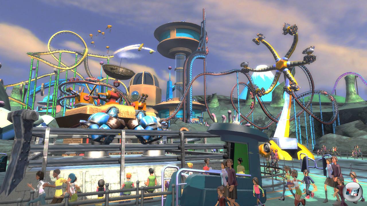 Doch obwohl die Herausforderung fehlt: Das Herumtollen im eigenen Freizeitland, während Mortimer im witzigen Radioprogramm Interviews gibt, macht unverschämt viel Laune! Es ist schon allein deshalb unterhaltsam, weil die fünf Parks mit ihren jeweils drei Abschnitten sehr unterschiedlich und aufwändiger als ihre Vorläufer gestaltet wurden. Das Thema, das sie wiedergeben, sieht man ihnen noch deutlicher an – auch wenn die mitunter stotternden Kulissen auf 360 und PC hinter den technischen Möglichkeiten zurückbleiben und ein paar Musikstücke mehr der Stimmung gut getan hätten. Als Science Fiction-Fan fühle ich mich aber im „New York von morgen“ mit seinen futuristischen Wolkenkratzern einfach pudelwohl. Abgesehen davon hat Frontier zudem mehr Arbeit in seine Fahrgeschäfte gesteckt. Wer in Verrückte Achterbahn eine solche oder eine Kartbahn bauen will, ohne erst selbst zum Designer zu werden, findet schon im mitgelieferten Katalog ausgesprochen abgedrehte Modelle. Außerdem wurde der ohnehin große Pool an Zeit verschlingenden Minispiele aufgestockt; um ein putziges Anime-Jump&Run, das witzige Prügelspiel „Bandito Chincilla“, eine Art Cyberspace-Rennen auf Schienen und viele weitere. Bei anderen Neuzugängen handelt es sich um neue Levels des bekannten Zeitvertreibs – der Titel „Luftwaffe II“ z.B. ist irreführend. Schade nur, dass die Entwickler keine Experimente mit den Möglichkeiten der Wii-Steuerung wagen, so dass sich die Minispiele bis auf Ausnahmen wie ihre PS2- und 360-Pendants anfühlen. Am PC spürt man hingegen, dass die dort etwas sperrige Steuerung ursprünglich für Gamepads zurechtgeschnitten wurde.
