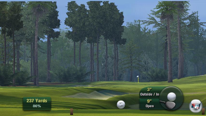 Während man übrigens bereits im vergangenen Jahr aus den Augen des virtuellen Profis über den Golfplatz schauen konnte, um sich an dem nicht vorhandenen Zoom zur Zielmarkierung im besten Sinne die Zähne auszubeißen, wird man diesmal noch mehr zum Golfer. Wahlweise blickt die Kamera nämlich vor jedem Schlag auf den Ball, wie es ein Golfer tun würde. Und es fühlt sich richtig falsch an, anschließend zur gewohnten Rückenansicht zurück zu kehren. Dabei ist nicht nur die Wahl der Perspektive den PS3- und 360-Fassungen überlegen, denn die naturgemäß weniger detaillierten Golfkurse sehen im Vergleich zu den Möglichkeiten schärfer aus, bieten stimmungsvolle Blicke gegen die Abendsonne und auch auf Wii werden manche Löcher im Regen geschlagen. Lediglich die akustische Umgebung scheint manchmal nur aus verlorenem Vogelzwitschern zu bestehen – gerade so, als hätte jemand den Ton aller restlichen Geräusche abgedreht. Die Kommentatoren Kelly Tilman und Scott Van Pelt geben hingegen meist zu früh bekannt, wo der Ball landen wird, so dass während des Flugs zu wenig Spannung aufkommt. Gelegentlich kommentieren sie einen Schlag auch gar nicht oder liegen glatt falsch. Kleinigkeiten, die im nächsten Jahr hoffentlich vermieden werden.