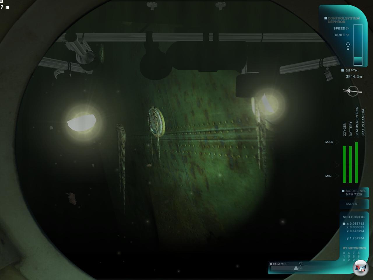 1985 von Ballard und Michel tatsächlich entdeckt und 1997 von Cameron zuletzt mit überwältigendem Erfolg cineastisch ausgeschlachtet, gibt es wohl kaum jemanden der sich dem Mythos entziehen kann. Mit einem Faible für Simulationen im Allgemeinen und Tauchspiele im Besonderen lege ich mit einiger Vorfreude die CD in mein Laufwerk und sehe meiner ersten Tauchfahrt gespannt entgegen. Nach einem kurzen Intro, welches das Mutterschiff der Expedition aus dem Hubschrauberrundflug zeigt, befinde ich mich auch schon im Startmenü. Keine große Vorgeschichte, keine Hintergrundinfos darüber wieso ausgerechnet ich heraubtauchen darf zum eisigen Grund des Atlantiks – einfach nur die üblichen Einstellungsmöglichkeiten. Also entscheide ich mich für den mittleren der drei Schwierigkeitsgrade und nach kurzer Ladezeit befinde ich mich auch schon im Inneren der „Nephron“, eines Spezial-U-Bootes zu Forschungszwecken. Überall Kontrollleuchten, Tastaturen, Schalttafeln und Displays, die allerdings allesamt nicht bedienbar sind. Eine Stimme aus dem „Off“ begrüßt mich und weist mich in die unkomplizierte Steuerung des Unterwasserfahrzeuges ein. Zunächst will die „alte Lady“ aber erst einmal gefunden werden, was mittels modifiziertem Echolot auch nicht all zu schwierig ist. In 3800 Metern Tiefe ist es stockdunkel und lediglich die beiden Hauptscheinwerfer meines U-Bootes werfen ein schummrigen Lichtkegel voraus. Die gespenstische Atmosphäre wird gut transportiert und nach einer Weile Irrfahrt taucht der Koloss auch schon unmittelbar vor dem runden Bullauge der Nephron aus der Dunkelheit hervor…gruselig! Bei diesem ersten Tauchgang darf ich mich allerdings noch nicht in das Innere des Liners hervor wagen. Es müssen zunächst vier Sonden an vorgegebenen Stellen um das Wrack herum positioniert werden. Dabei gibt mir mein „Co-Pilot“ aus dem Off Anweisungen (Norden, Süden, rechts, links etc.) nach denen ich mich orientieren soll. Das funktioniert einigermaßen, die visuelle Zielanzeige im leichteren Schwierigkeitsgrad ist da natürlich komfortabler, allerdings auch unrealistischer.