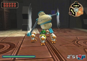 Tokobots ständig neue Fähigkeiten, die ihr meist umgehend anwenden sollt – der Spielfluss gewinnt deshalb nur schleppend an Fahrt. Von Bolts gemächlichem Tempo sowie gelegentlichen unfreiwilligen Zeitlupen ganz abgesehen. Leider scheint das prähistorische Volk auch wenig von der Kunst des Hausbaus zu verstehen, denn die grau-braunen Mauern erinnern an den eckigen Grundriss der Grabmäler im ersten Tomb Raider – ohne deren abwechslungsreiche Kulisse.Farbe bringen nur die Akteure, sowohl bei Freund als auch bei Feind, ins Spiel – jedenfalls äußerlich. So sinnvoll es nämlich sein mag, die Tokobots nicht nur in Rätseln einzusetzen, sondern auch als Waffe zu verwenden, so stupide sind die meisten Auseinandersetzungen. Ihr bekommt es mit den immer gleichen Robotern zu tun, die an Duplo-Figuren erinnern und statt dynamische Duelle zu erleben, müsst ihr einfach nur langsam Ausweichen und Zuschlagen. Besonders umständlich ist die Steuerung, wenn ihr mit den „Leiter“-Tokobots treffen wollt: Während seine Helfer hinter ihm eine Reihe bilden, kann Bolt seine Blickrichtung nicht mehr ändern, so dass ihr entweder ständig die Verbindung zwischen den Bots löst, euren Helden dreht und die Bots erneut verbindet oder euch dauerhaft nur seitwärts bewegt. Von der Kamera, die ihr selten frei bewegen könnt, weil sie an allen Hindernissen „hängen“ bleibt, ganz zu schweigen. Die fehlende Übersicht ist das größte Ärgernis. Ihr dürft zudem nicht einstellen, wie die Bewegung des rechten Sticks die Kamera dreht. Ich habe mich deshalb die gesamte Zeit über eine verkehrte Kamerasteuerung geärgert.