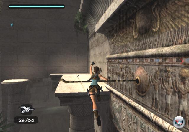 Da helfen auch die exklusiven Wii-Features nicht mehr viel, bei denen ihr z.B. mit einer Bürste den Staub von Artefakten entfernen und anschließend Abdrücke von Reliefen anfertigen könnt – und das selbstverständlich mit entsprechenden Remote-Bewegungen. Auch eine Spitzhacke zum Zerstören brüchiger Wände sowie eine Spachtel zum Entfernen von Mauerreliefen gehören auf Wii zu Laras Ausrüstung. Letzteres erinnert dabei sogar an das Schlösserknacken in Splinter Cell, da ihr die Stelle zunächst mit einer Lupe absuchen müsst und die Rumble-Funktion an einer Schwachstelle losrüttelt. Ebenfalls neu sind manche Rätsel, die in Zusammenhang mit den Archäologie-Aufgaben stehen. So finden sich vor einigen Türen neuerdings Schalter, bei denen ihr zunächst einige Zylinder in die richtige Reihenfolge bringen müsst, die ihr zuvor durch das Anfertigen eines Abdrucks von einem frei gebürsteten Relief erhalten habt. Auch die Schalterrätsel mit den Zahnrädern wurden für die Wii-Umsetzung leicht überarbeitet: Hier müsst ihr die entsprechenden Teile nicht nur finden, sondern auch manuell richtig anordnen, damit die Zahnräder auch ineinander greifen. Last but not least müsst ihr euch hin und wieder auch als Künstler betätigen und selbst mit der Remote Formen zeichnen oder sie abtasten. Eines wird deutlich: Die Entwickler haben sich viele Gedanken gemacht, um das Spiel an die Fähigkeiten der Wii-Konsole anzupassen, doch ging leider nicht alles auf – allen voran das schlimme Hantieren mit der Kamera. Auch grafisch hätte man durchaus etwas mehr erwarten können, denn die Kulissen sehen hier genau so aus wie auf der betagten PS2, während die Performance in großen Arealen wie etwa dem Kampf gegen den T-Rex auch schon mal von kleinen Slowdowns heimgesucht wird. Deshalb hinkt die Wii-Umsetzung trotz einiger interessanter Steuerungsansätze insgesamt den anderen Fassungen hinterher.