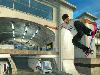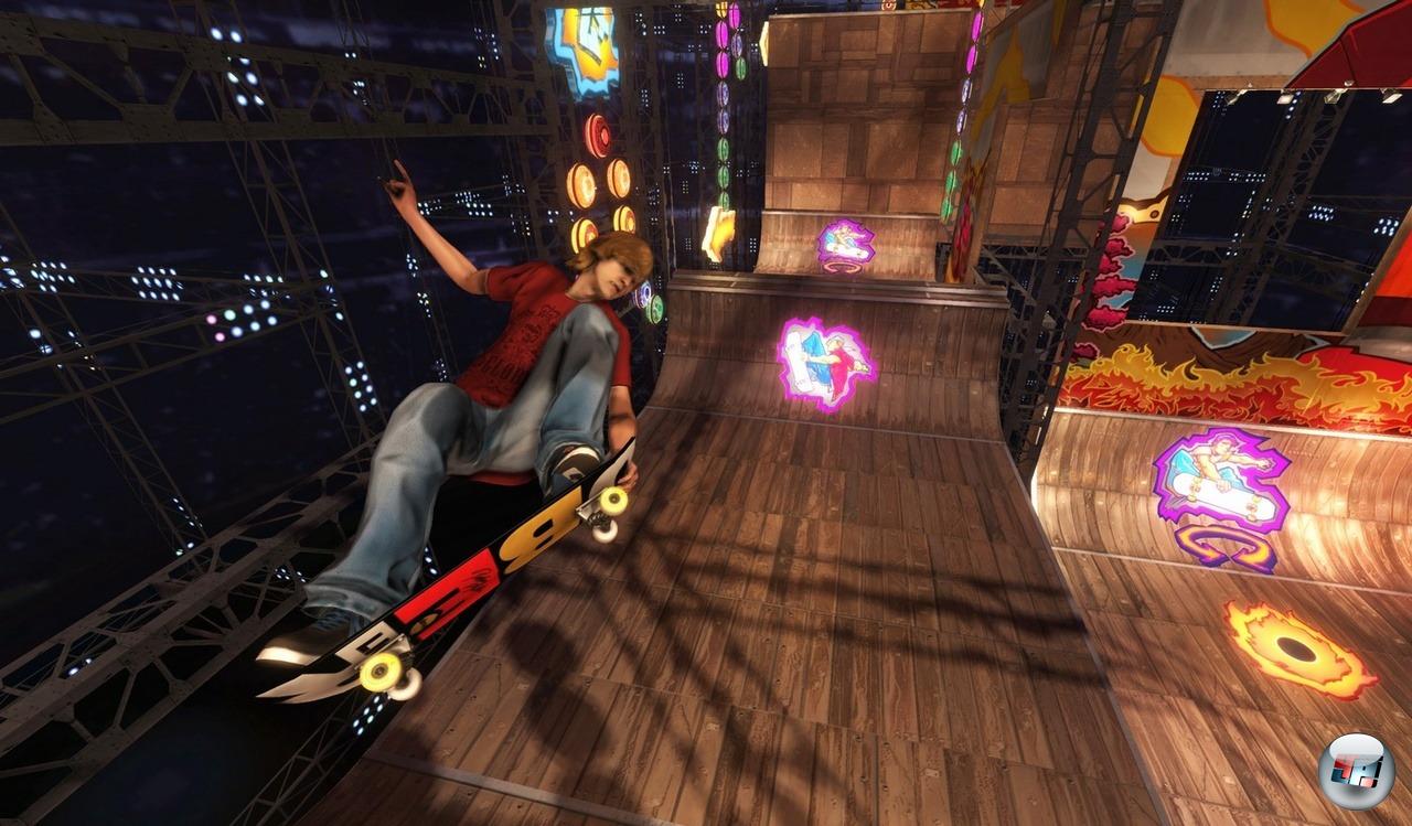 Die Vert-Challenges laufen praktisch wie auf Schienen ab. Zwar kann man mit einer Neigung leichte Richtungsänderung vollführen, aber im Grunde genommen befindet man sich hier im Casual-Modus. Ein Indiz hierfür ist die Schwierigkeit: Ich habe in allen Vert-Herausforderungen stets nur einen Versuch gebraucht, um den Highscore zu brechen. Die Drehungen in der Half-Pipe klappen ganz gut, auch die Grabs, Handplants und Stalls laufen solide ab. Das sind dann auch die Momente, wo sich die Wii-Oma mit ihren Enkeln vor Spaß ein Ast ablacht, hingegen die Vert-Challenge mir nur ein: „Okay, das ist echt ganz nett“ entlockt. RIDE beinhaltet auch andere Challenges, wie z.B. die Wheelie-Challenge oder diverse Contests, die eigentlich nur zeitlich oder auf bestimmte Obstacles begrenzte Trick-Challenges sind. Ach ja, und zum Schluss in Barcelona tritt man in dem bekannten Galgenspiel „skate“ gegen Nyjah Huston an, was wiederum ein Selbstgeständnis für die miserable Steuerung ist, tauchen dort auch Ollies, Nollies und Manuals auf – die einzigen Tricks, die mit Sicherheit gehen. Aus Kickflip wird der Double Kickflip, aus einem Impossible ein Shove-It und statt 360-Flip sehe ich ein Heelflip. Einen Moment, ich hole mal die Münze aus der Hosentasche.