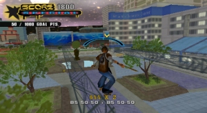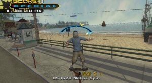 weiter als eine grafisch ansehnlich umgesetzte Zeitlupe, die man etwas fummelig per Stups auf den Analognippel aktivieren kann, sobald die Special-Leiste gefüllt ist. Für Tony-Neulinge und kritische Manöver dennoch eine praktische Sache – schließlich lassen sich damit Tricks genauer landen, oder man hält Grinds präziser. Der »Freak Out« ist nur halb-neu, schließlich gab es ihn schon in THUG, allerdings wurde er dort zufällig gezündet: Vermasselt ihr eine aussichtsreiche Kombo, habt ihr kurz Zeit wie wild auf die Grind-Taste zu hämmern, um die Freak Out-Anzeige zu füllen. Je nachdem wie voll ihr sie kriegt, zerhackstückt euer Skater sein Board anders. Außerdem bekommt ihr so einen Teil eurer verlorenen Zähler zurück – da das Spiel allerdings kaum noch Wert auf Punktehascherei legt, spielt das im Grunde keine Rolle mehr. Und so erfreut man sich nur ein oder zwei Mal an den unterschiedlichen Wutausbrüchen, hinterher spart man sich die Zeit. Außerdem dürft ihr noch für einige Missionen mit Tomaten um euch werfen. Ihr steuert ausschließlich per Digipad, darüber hinaus ist der rechte Schulterbutton mehrfach belegt – je nach Aktion (Pipe-Übergang, Landung etc.) macht er etwas anderes, schließlich fehlen der PSP die zusätzlichen Schultertasten der PS2.Last Skater Standing