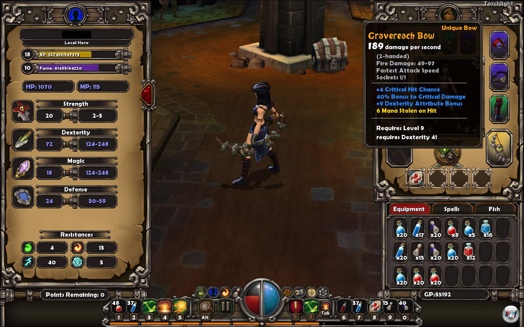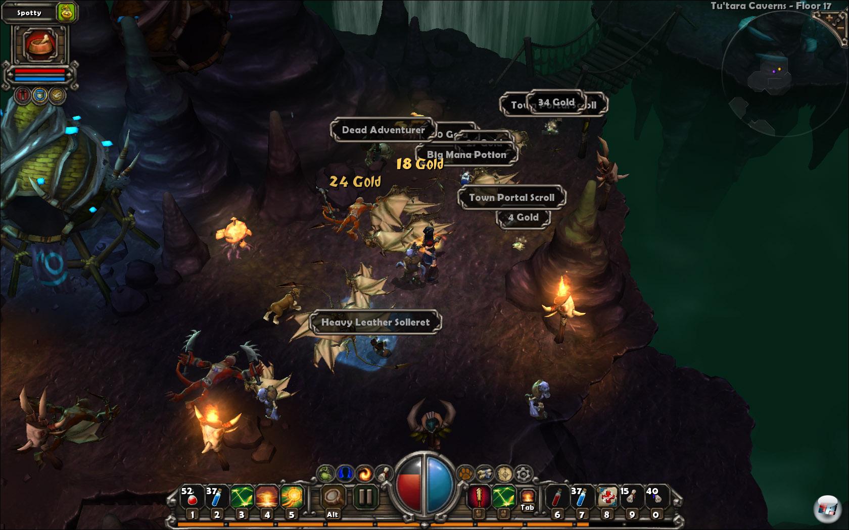 Beute gibt es in Hülle und Fülle und in allen nur erdenklichen Güteklassen (gewöhnlich, selten, rar, episch, einzigartig, Sets), was den Inventarplatz trotz mobilem Begleiterlager überflutet. Abseits von Waffen und Ausrüstungsgegenständen dürfen Edelsteine zur Gegenstandsverbesserung (Stichwort: Sockel) nicht fehlen und sogar Heil- und Manatränke sind irgendwann notwendig – jedoch nicht am Anfang. Torchlight beginnt sehr einfach und stellt bis fast Stufe 15 bis 20 keine großen Herausforderungen, sofern ihr euch nicht allzu ungeschickt in die erste Reihe stellt oder stets voranprescht. Erst später, also viel später, wird es kniffelig, wenn die Feinde mehr Schaden anrichten, in fieseren Kombinationen auftauchen (Nah-/Fernkämpfer, Beschwörer, Flächeneffekte, etc.), euch in zahlenmäßiger Überlegenheit einkreisen oder schlachtkräftigere Bossgegner auftauchen. Womit euch die Gegner übrigens zu Leibe rücken oder welche besondere Fertigkeit sie haben,