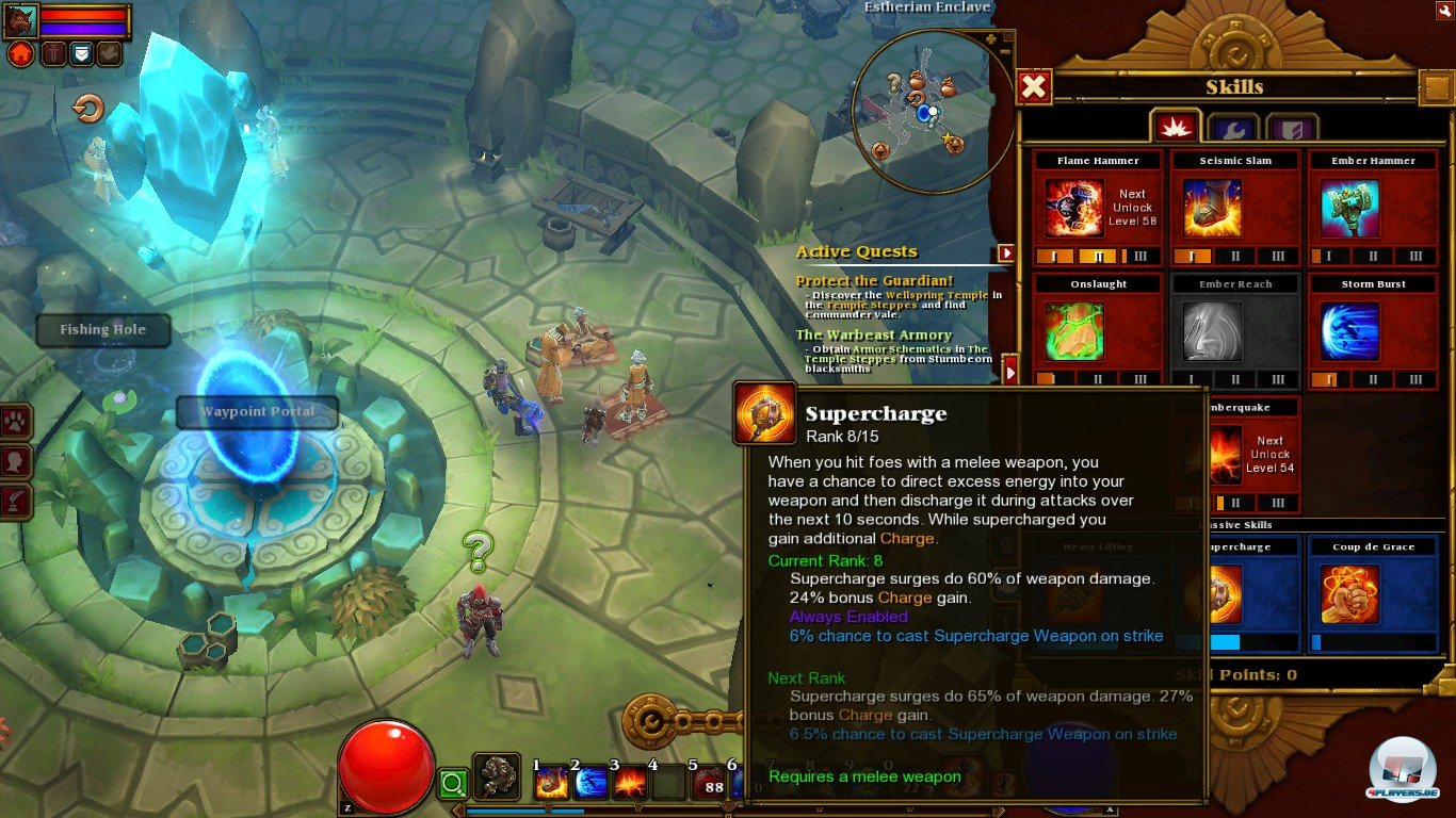 Interessante Skills finden sich bei jeder Klasse wie z.B. „Death’s Bounty“ vom „Embermage“. Diese Fläche kann auf dem Boden platziert werden und alle Gegner, die dort sterben, geben Lebensenergie und Mana – sogar für Mitspieler. Sonderlich viele unterschiedliche Skills hatte ich beim Durchspielen als „Engineer“ übrigens gar nicht verwendet: Flammenhammer, Seismic Slam (Donnerstampfen mit Betäubung), Ansturm, Emberquake, Supercharge und Zweihandwaffen-Bonusschaden wählte ich als Fertigkeiten aus der Blitz-Kategorie und reicherte sie mit dem Heil-Bot und der passiven Rüstung aus den anderen Spezialisierungen an. Andere Spielweisen sind durch bestimmte Talente ebenso möglich, z.B. als Tank mit Schwert und Schild oder mit der Hilfe von Unterstützern. [GUI_PLAYER(ID=87987,width=475,text=Der Berserker und seine Fähigkeiten werden vorgestellt.,align=left)] Gänzlich neu ist die Charge-Leiste, über die jeder Charakter verfügt. Durch schnelles und möglichst pausenloses Austeilen von Schaden wird diese Leiste aufgeladen und spendiert mächtige Kampf-Boni. Beim „Outlander“ werden beispielsweise Zauberzeit, Ausweichchance, kritische Trefferchance und Angriffsgeschwindigkeit durch die Charge-Leiste beeinflusst. Der „Engineer“ verstärkt dadurch seine Angriffe und der „Embermage“ kann bei voller Leiste einen Zustand erreichen, bei dem seine Zaubersprüche kein Mana mehr verbrauchen. Der Charge-Aspekt spiegelt das rasante Kampfsystem klar wider.
