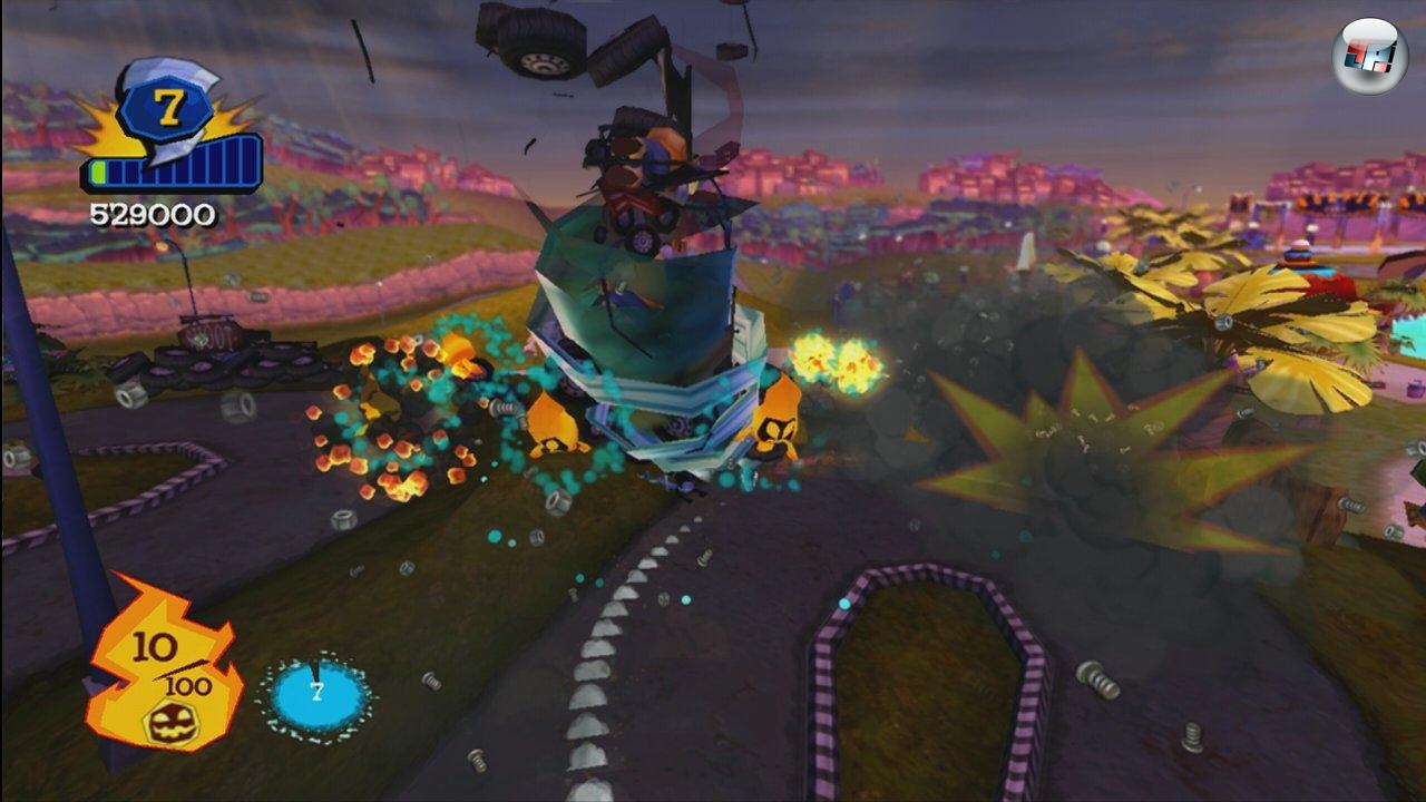 oder – ganz neu – als Riesen-Tornado durch die Pampa. Bleibt ja alles, wirklich alles, an meinem windigen Charme kleben: Sträucher, Mülltonnen, Zäune, Autos, Windmasten, Häuser, Militärbasen und überhaupt alles. Natürlich nicht von Anfang an; ohne Fleiß kein Preis. Heißt, ich staubsauge erst kleine Dinge, dann mittelgroße, dann die ganz schweren Kaliber auf. Wie praktisch, dass alles, was ich aufwirbeln kann, nervös zittert, sobald meine Größe eine Gefahr darstellt. Zu drolligen Comicbildern tönt’s mal beschwingt, mal gibt’s Country, mal spielt die Kapelle militärisch.[GUI_FLVPLAYER(width=300,height=188,STREAMINGID=36978,image=http://static.4players.de/premium/ContentImage/90/44/143738-bild.jpg)]
