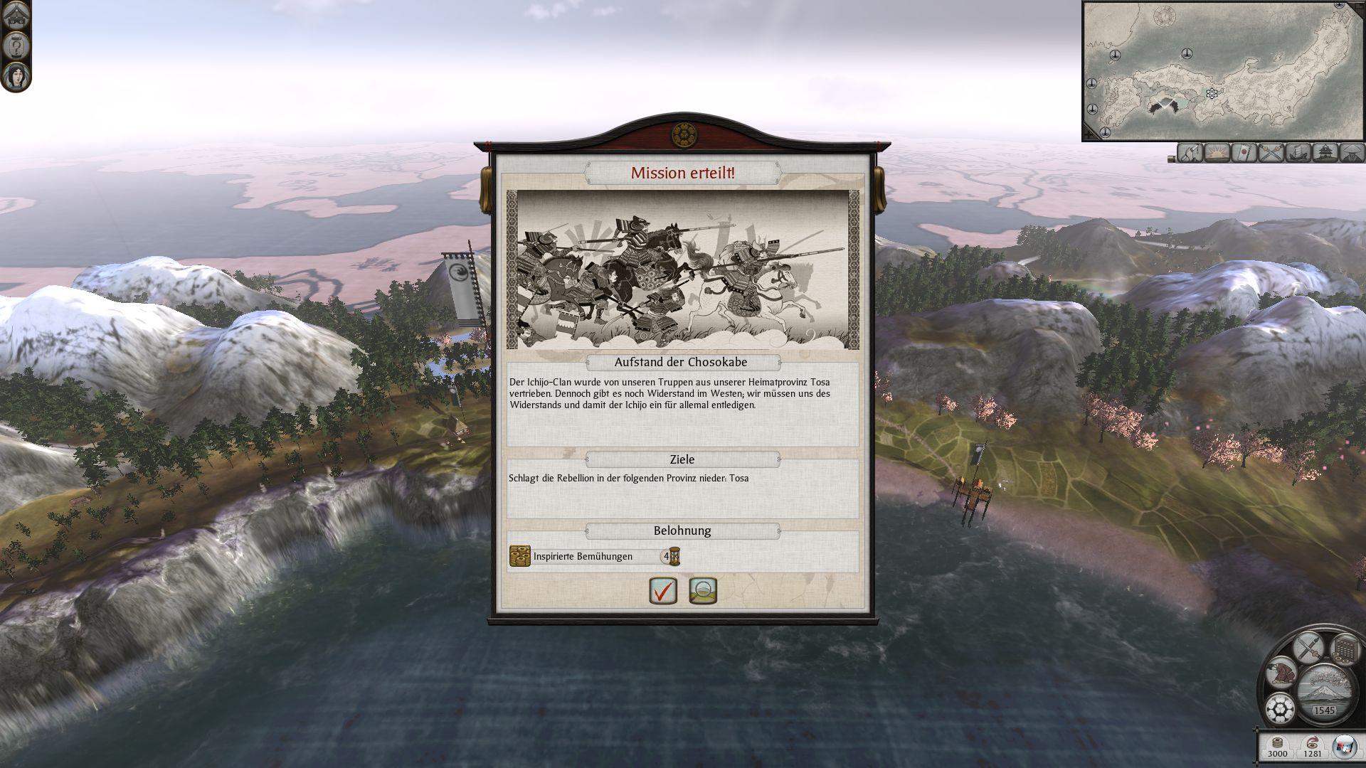 Aber all der optische Schnickschnack hilft mir als Fürst der Uesugi derzeit nicht. Was mir bleibt ist eine relativ gut gefüllte Kriegskasse, eine kleine Flotte an einem der fünf lukrativen Handelsposten sowie ein Vasall im Süden, der mir den Rücken frei hält. Es dürfte allerdings knifflig werden, das Ziel der kurzen Kampagne zu erreichen: Ich soll bis 1575 nicht nur 25 von 65 Provinzen besetzen, sondern auch die Hauptstadt Kyoto erobern und ein Jahr lang halten – das sind vier Runden im Spiel, die jeweils eine Jahreszeit symbolisieren. Ich hätte auch die lange Variante (40 Provinzen) oder die Weltherrschaft (60 Provinzen) bis zum Jahr 1600 wählen können.