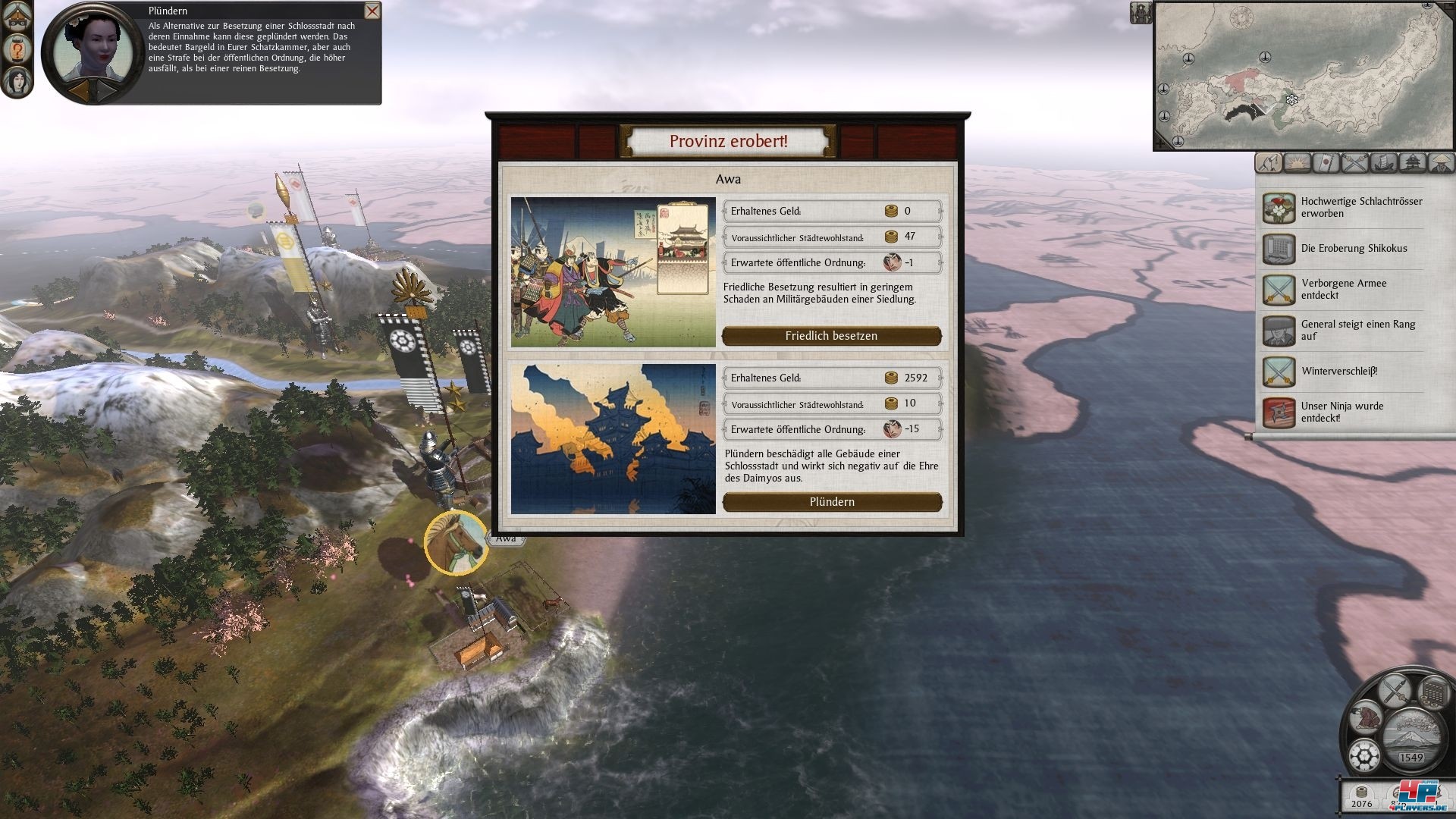 Und das sorgt dafür, dass man bei frühen Erfolgen und Eroberungen in diplomatische Schwierigkeiten kommen kann – schließlich kämpfen neun Clans um den Thron. Da muss man schon sehr stabile Bündnisse schließen und pflegen, damit einem Alliierte kurz vor Kyoto nicht in den Rücken fallen. Hier helfen vor allem politische Heiraten und Geiseln. Man kann als Familienoberhaupt mit bis zu vier Brüdern im Schlepptau ein gewisses Personal-Management betreiben und Geiseln mit anderen Clans austauschen oder eigenen Nachwuchs (der eigene männliche Nachfolger ist natürlich sehr wichtig, denn sonst wird die eigene Dynastie nicht weiter leben) sinnvoll verheiraten. Vor allem störrische Clans, die weder handeln noch quatschen wollen, lassen sich manchmal mit einer Geisel bewegen.