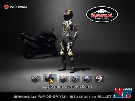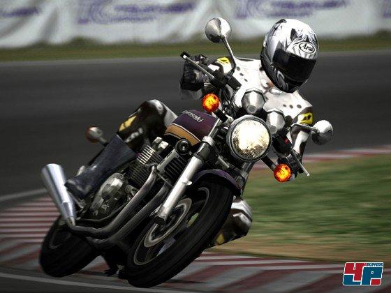 Auch die Mode kommt nicht zu kurz: Ihr habt die Auswahl zwischen einer Vielzahl an Helmen, Jacken, Handschuhen und Stiefeln meist lizenzierter Hersteller und gewinnt neben neuen Maschinen auch ständig weitere Biker-Klamotten. Allerdings solltet ihr die Rennpisten nicht mit einem Laufsteg verwechseln, wenn ihr mit Vollgas und jenseits der 300Km/h über die Geraden donnert. Gelungen ist vor allem die Cockpit-Perspektive mit originalgetreu modellierten Instrumenten, bei der euch bei hohen Geschwindigkeiten der Wind nur so um die Ohren pfeift. Ansonsten wird nur Durchschnittskost für eure Ohren geboten: Zwar klingen einige Motoren schön knackig, dafür andere wiederum sehr synthetisch. Die Hintergrundmusik mit ihren düdeligen Menü-Themen und gewöhnungsbedürftigen Songs während der Rennen ist dagegen kaum der Rede wert. So richtig übel ist allerdings das Strafsystem, das optional aktiviert werden kann: Hier wird jeder noch so kleine Ausritt neben die Strecke mit einer zehnsekündigen Weiterfahrt in gedrosseltem Tempo bestraft – egal, ob ihr euch dadurch einen Vorteil verschafft habt oder nicht. Meistens seid ihr jedoch schon gestraft genug, wenn ihr durch eine Unachtsamkeit die Straße verlasst, denn seid ihr erst mit einem Reifen auf dem rutschigen Grün, lässt sich die Maschine nur noch selten abfangen und ein Unfall wird unvermeidlich. Allerdings werdet ihr schnell wieder auf die Strecke zurückgesetzt – und das oft sogar weiter vorne –, so dass ihr zeitlich kaum Verlust macht. Ein Schadensmodell gibt es genau wie bei Gran Turismo auch hier leider nicht, so dass Fahrer und Maschine jeden noch so starken Aufprall unbeschadet überstehen.