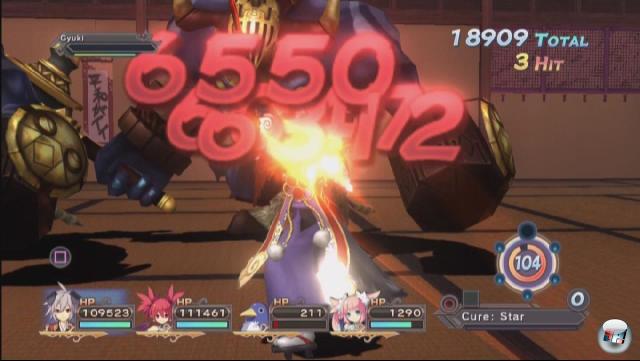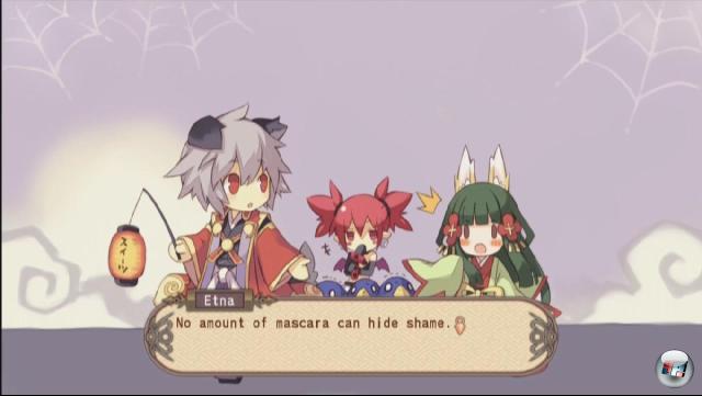 Auch die Story plätschert völlig belanglos vor sich hin und lebt einzig von ihren amüsanten Dialogen, in denen sich selbst die Figuren teilweise über den Plot oder ihre Rollenverteilung beschweren, was die Missstände zwar irgendwie sympathisch, aber nicht besser macht. Manchmal ist der Humor zwar genauso flach wie Etnas immer wieder als Gesprächsthema dienenden Brüste, aber die mitschwingende Selbstironie bringt einen trotzdem zum Schmunzeln. Und dann sind da ja auch noch die unter Etnas Wutausbrüchen leidenden Prinnys, die um keine faule Ausrede verlegen sind, ständig nach besserer Bezahlung und Alkohol lechzen und doch immer den Kürzeren ziehen.