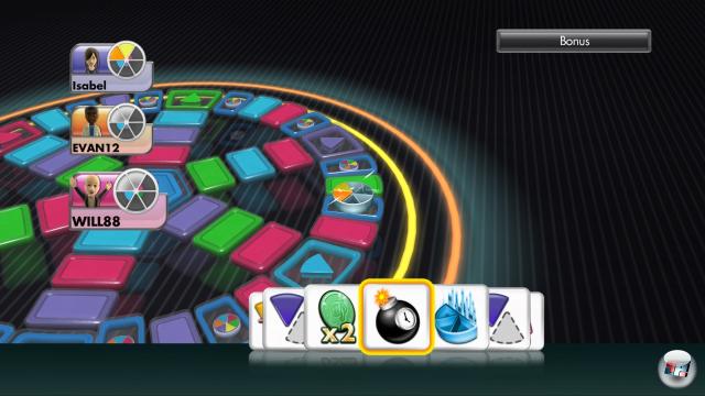 der das Spielprinzip strafft und beschleunigt: Hier ist man automatisch abwechselnd an der Reihe, außerdem kann man darauf wetten, ob der aktuelle Teilnehmer die Frage richtig oder falsch beantworten wird – Klugscheißer können sogar darauf setzen, dass der andere versagt und sie für ihn die Antwort übernehmen. Zusätzlich gibt es hier Bonusitems, die das Spielgeschehen erheblich beeinflussen können, denn die Jagd nach den Ecksteinen des Trivial Pursuit-Boards ist entscheidend: Wurde ein Eckstein eingesackt, wird das Feld um die entsprechende Kategorie verkürzt und damit immer kleiner. Am Ende zählen die erbeuteten Steine als Leben, in der letzten Fragerunde gilt es schnell und richtig zu antworten – falsche Antwort, ein Leben weniger. Wer also zwischendurch ein Item erwischt, mit dem er einem Konkurrenten ein Leben abluchsen kann, hat dadurch am Ende mehr Chancen. Und vermutlich einen Freund weniger. Statistikfreunde können sich während des Spiels an einem am unteren Bildschirmrand entlang scrollenden Newsticker ergötzen, der stets aktualisierte Informationen über das aktuelle Geschehen vorrätig hat: Welcher Spieler hat wie oft in welchem Aufgabengebiet versagt, wie lange spielt man schon, welche Nase liegt vorn usw. Auf der 360 wird man von den lachenden Avataren begleitet, auf den anderen Konsolen von vorgefertigten Gesichtern – selbst auf Wii, wo erstaunlicherweise nicht die Miis genutzt werden.![]()