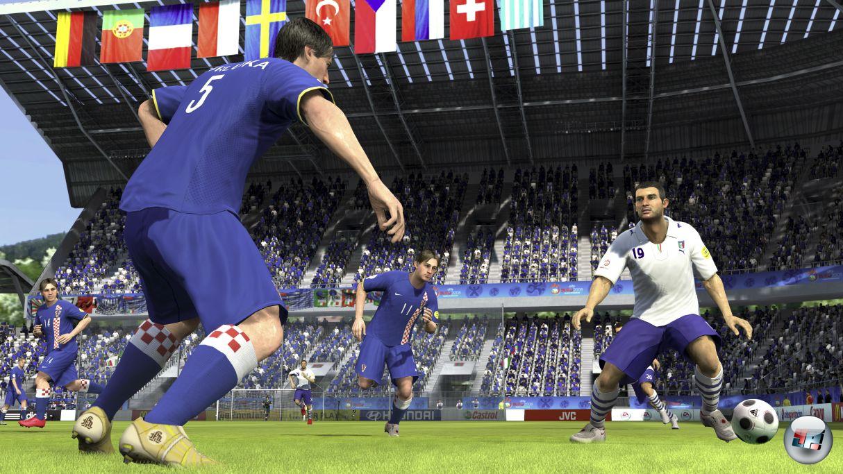 Technisch bewegt sich Euro 08 auf dem Niveau des aktuellen FIFA, wobei EA bei den Details der Spielermodelle wieder einen kleinen Schritt nach vorne gemacht hat. Daneben punktet der Titel wie üblich mit einer hervorragenden Stadionatmosphäre und dem gewohnt starken Lizenzpaket, das euch in den acht Original-Schauplätzen in Österreich und in der Schweiz zum Anstoß bittet. Mit stärkerer Kantenbildung, kleinen Rucklern und schwächeren Nahaufnahmen fällt die PS3-Fassung gegenüber dem 360-Gekicke leicht schwächer aus. Da ist es ein schwacher Trost, dass ihr auf der Sony-Konsole offline mit bis zu sieben Mitspielern dem runden Leder nachjagen könnt (Xbox 360: maximal 4) und auch online maximal vierzehn anstatt acht (Xbox 360) Teilnehmer möglich sind. Doch auch spielerisch leidet die virtuelle EM an den alten FIFA-Problemen: Das flimmernde Klonpublikum bekommt oft nur einen zähen Spielablauf geboten und gerade in den engen Räumen vermisst man spielerische Freiheiten, um für mehr Dynamik auf dem Rasen zu sorgen. Hier habt ihr einfach zu wenig Kontrolle über die Dribblings und vermisst zudem individuelle Stärken eurer Stars. Auch die KI sorgt manchmal immer noch für Kopfschütteln, wenn z.B. die eigenen Stürmer bei einer günstigen Freistoßposition ihre Hintern nicht in den Strafraum bewegen wollen. So bleibt auch UEFA Euro 08 spielerisch insgesamt auf dem guten, aber nicht überragenden Niveau der FIFA-Vorlage.