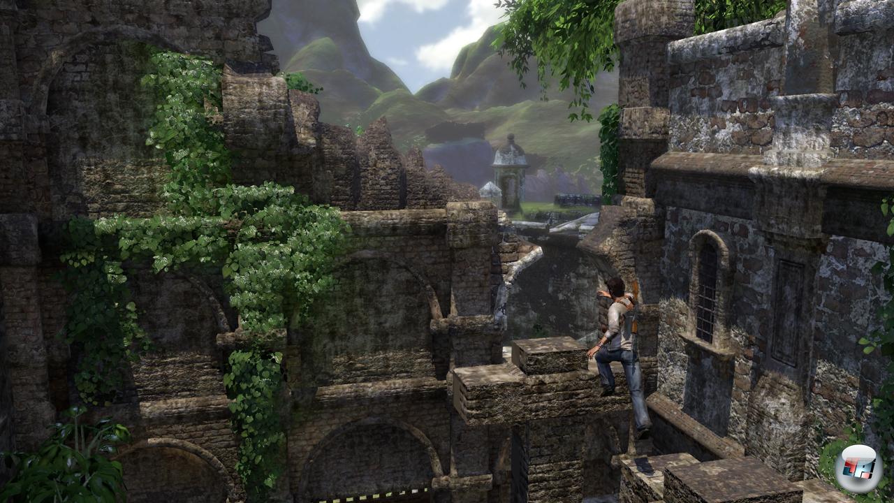 schönsten Szenen aus ICO <a class="DYNLINK" onmouseover="DynToolTipp_Show('Klicken für Gameinfos‚)“ onmouseout=“DynToolTipp_Hide(); “ href=“javascript:DynCont_Display(‚Gamefinder‘,’runmod.php?sid=%7BSID%7D&LAYOUT=dyncont_gf&spielid=2008′)“> erinnern könnte, an diese monumentale Pracht und dieses herrliche Spiel mit dem Licht. Wenn man mit Drake klettert, kann man sich der Ähnlichkeiten hinsichtlich der Sprungtechnik, der Kulisse und Perspektivwechsel nicht entziehen: Da ist diese mächtige Steilwand. Die Kamera fährt fast zurück an den Horizont, die Sonne brennt sich in den kalkweißen Putz einer mächtigen Festung. Ihre Ausmaße? Gigantisch. Wie ein Monument längst vergangener spanischer Macht ragt sie an der Küste empor. Man bekommt ein Gefühl von der fremden Größe und der eigenen Mickrigkeit – und das wesentlich intensiver als im letzten Tomb Raider <a class="DYNLINK" onmouseover="DynToolTipp_Show('Klicken für Gameinfos‚)“ onmouseout=“DynToolTipp_Hide(); “ href=“javascript:DynCont_Display(‚Gamefinder‘,’runmod.php?sid=%7BSID%7D&LAYOUT=dyncont_gf&spielid=11939′)“>.