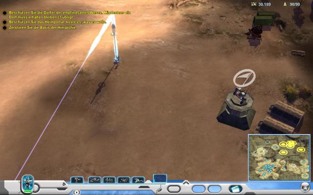 Den Gegenpol zu den Hierarchy bilden die Novus. Sie errichten zunächst eine Basis und produzieren in klassischer Manier ihre Truppen in Gebäuden, allerdings müssen sich alle Bauwerke innerhalb eines Energiefeldes befinden, das sich mit getarnten Netzwerktürmen entfalten lässt. Netzwerktürme lassen sich überall auf der Karte platzieren, haben jedoch nur eine bestimmte Reichweite, die sie von einem anderen Turm entfernt stehen dürfen. Habt ihr alles richtig gebaut, sind die Türme dann untereinander mit einem