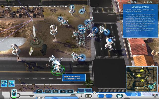 Zu den Schwächen der Computerintelligenz gesellen sich Tiefpunkte bei der Wegfindung: Manche Einheiten wollen partout nicht dahin gehen, wohin sie sollen, nehmen unglaubwürdige Umwege und es ist sogar vorgekommen, dass die Novus ihr Netzwerk vergessen haben und quer über die Karte gelaufen sind. Viel nerviger ist jedoch, dass eure Truppen daueraggressiv sind. Wirft ein Gegner mit Kieselsteinen auf eure Jungs, verfolgen sie ihn bis in den Tod (meist in den eigenen). Es gibt keine Option in der Befehlsleiste das Einheitenverhalten auf „passiv“ oder „defensiv“ zu stellen! Apropos Interface: An dem Aufbau und den beschränkten Bauketten kann man erkennen, dass das Interface ebenfalls für Konsolen entworfen wurde. Man kann die Produktionsbefehle einerseits klassisch der Baueinheit direkt geben oder in dem man den Gebäudebau-Button in der unteren Leiste betätigt, worauf ein Menü mit allen Bauoptionen aufpoppt. Gleiche Buttons gibt es für Infanterie-, Fahr- und Flugzeugproduktionsstätten. Was zunächst seltsam anmutet, geht mit der Zeit gut von der Hand, da man an der Front fix neue Truppen in Auftrag geben kann. Kurios ist, dass das Menü sehr klickempfindlich ist: Wenn man in Windeseile fünf Nahkämpfer haben will und den Mausbutton behämmert, kann es sein, dass nur zwei Truppen bestellt werden und sich das Menü danach dankbar schließt – wie nervig, besonders wenn’s schnell gehen soll!