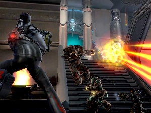 nebenbei stehen auch noch eure Spezialfähigkeiten (z.B. Geschwindigkeits-Boost oder Heilen) auf dem Programm, die ihr durch ein Menü während der Matches aktivieren könnt (natürlich ohne Spielpause!) und ohne die ihr eh kaum eine Chance habt, das Gemetzel zu überleben. Bei einem solch hohen Spieltempo ist der durchschnittliche Shooter-Fan schlichtweg überfordert. Wie man bei all der Hektik auch noch die Zeit haben soll, die neuen Finishing-Moves auszuführen, ist mir ebenfalls ein Rätsel. Schade, denn insgesamt ist die Steuerung sehr gut gelungen und reagiert äußerst präzise und schnell. Aber was nützt die beste Steuerung, wenn man die viel zu flinken Gegner einfach nicht trifft?