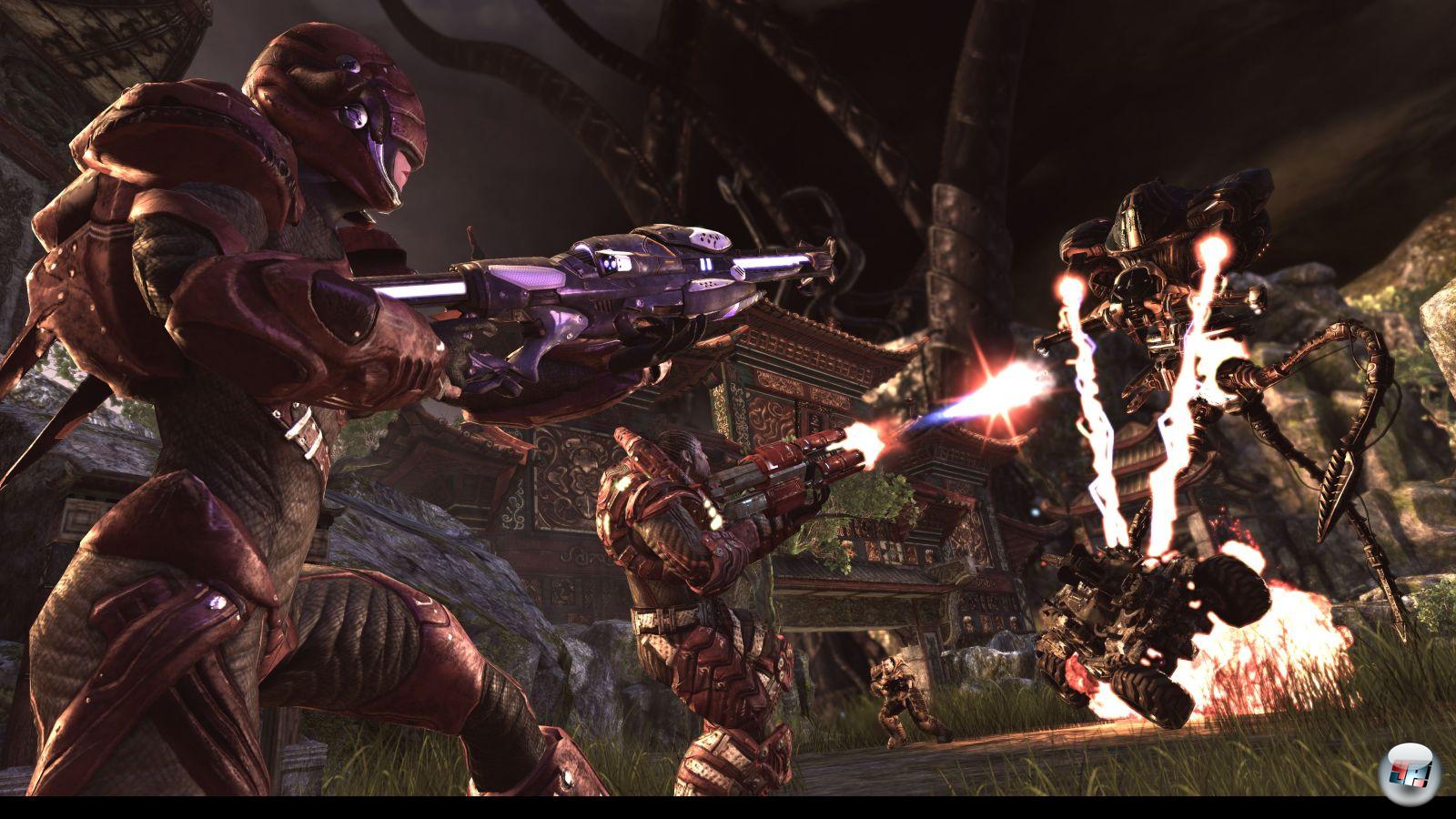 Die schlechte Nachricht ist, dass das Spiel auch in den Nachteilen der PC-Fassung spurgenau folgt. In erster Linie betrifft das die bescheuerte Story in der Kampagne, die nur von der grausamen deutschen Sprachausgabe getoppt wird – ein kleiner Trost ist immerhin, dass die Sprüche im englischen Original auch nicht besser sind. Aber wenigstens cooler klingen. Wie auch immer: Als langes Tutorial, das den Spieler auf den harten Online-Alltag vorbereitet, erledigt die Kampagne ihren Job sehr gut – und die Story kann man ja als F-Movie-Rahmen mitnehmen. Darüber hinaus sind die Bots mehr als kompetent, und problemlos fähig, den durchschnittlichen Spieler ordentlich aus den futuristischen Latschen zu hauen. Darüber hinaus müssen Käufer der deutschen Fassung natürlich auch mit den bekannten Schnitten leben: Kein Blut, kein Gore weit und breit.