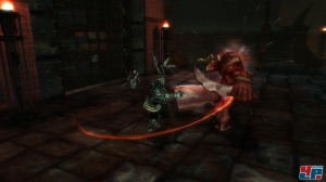 Dutzende Skelette fallen vor mir zu Boden, aber mein Krieger setzt noch einen drauf: Ein mächtiger Zauber trifft die Untoten, dann geht Golan Kor in die Luft, lässt seinen Hammer auf den Boden niedergehen und wirft den gehörnten Zwischengegner zurück. Doch seine Kraft ist fast am Ende und bevor er den fernen Speicherpunkt erreicht, geht mein Held zu Boden. Jetzt liegt der Kampf in den Händen von Zala, seiner Mitstreiterin –