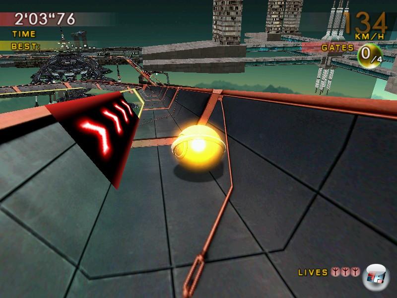 Im späteren Spielverlauf bin ich auch auf etwas offener gestalteten Kursen mit diversen Abkürzungen unterwegs – mehr Spaß macht das aber auch nicht. Im Gegenteil: Als ob die Kurse an sich nicht schon mit genug frustigen Stellen ausgestattet wären, versaut mir die nervöse Kamera regelmäßig den Balance-Akt. Die Perspektive lässt sich zwar kurzzeitig per Knopfdruck in die Draufsicht umschalten, doch der Wechsel verwirrt mehr, als das er nützt. Sobald ich den Knopf loslasse, rollt die Kugel nämlich urplötzlich in eine andere Richtung als noch eine halbe Sekunde vorher. Auch die im Level verstreuten Sammelobjekte, leichtes Kugel-Tuning und die öden Multiplayer-Spielchen wie Fußball, Bowling und ein einfaches Deathmatch können das Spiel nicht retten. Eine nette Idee ist der alternative Arcade-Modus im Stil von Outrun und Xyanide Resurrection, bei dem man den Schwierigkeitsgrad über eine Abzweigung wählt. Mehr Spaß machen die unausgegorenen Strecken dadurch trotzdem nicht.