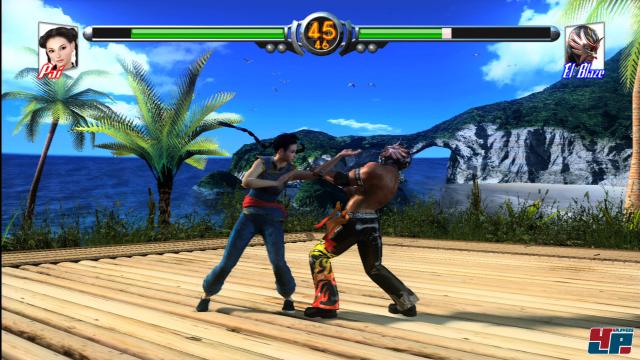 Würfe, Schlag- und Tritt-Techniken der Martial Arts interessiert, wird hier von einer Fülle an wirklich sauberen Bewegungsabläufen belohnt. Die Figuren wirken angenehm natürlich, nicht ganz so künstlich oder plastisch wie in anderen Spielen, aber sie haben noch lange nicht diese Lebendigkeit in Sachen Muskeltanz und Mimik erreicht wie etwa in Fight Night Round 3 <a class="DYNLINK" onmouseover="DynToolTipp_Show('Klicken für Gameinfos‚)“ onmouseout=“DynToolTipp_Hide(); “ href=“javascript:DynCont_Display(‚Gamefinder‘,’runmod.php?sid=%7BSID%7D&LAYOUT=dyncont_gf&spielid=7705′)“>. Hier wird niemand von der nächsten Generation der Beat‘ em Ups verblüfft. Ihr werdet kein Schwitzen, kein Blut, kein Muskelpumpen, keine Verletzungen sehen. Schweiß und Knochenbrüche gehören immer noch nicht in die Welt der Arcadekämpfe. Warum eigentlich nicht? Könnte man das Genre über diesen Schritt nicht aufwerten?