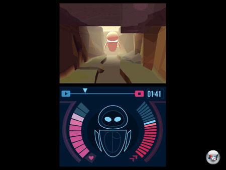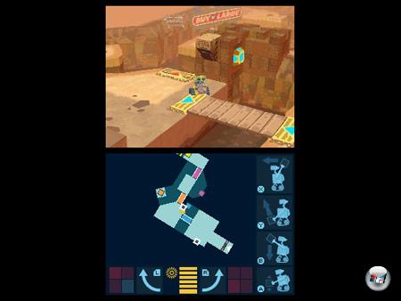 Alle paar Räume wird dabei gespeichert und wer zu viele Fehlversuche verbucht, wird an den Levelanfang zurückversetzt. Gerade letzteres kann teils ziemlich nerven, da viele Abschnitte auf Trial&Error basieren und WALL-E die Angewohnheit hat, ständig in tödliche Abgründe zu stürzen, wenn er nur schon in deren Nähe kommt. Manchmal sind die Abgründe aber auch gar nicht als solche auszumachen, weil die lediglich rotierbare Kamera die 3D-Umgenungen alles andere als übersichtlich präsentiert. Auch die Sichtweite ist teils ziemlich knapp bemessen, so dass erstmalige Fließband-Fahrten schnell tödlich enden können. Auch die meist völlig nutzlose Übersichtskarte auf dem zweiten Bildschirm ist hier keine große Hilfe.
