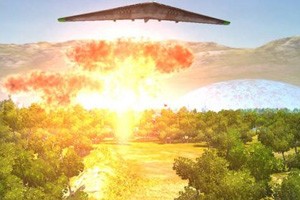 | Ein amerikanischer Stealth-Bomber wirft seine explosive Fracht ab. Im Hintergrund ist außerdem ein Schutzschild zu sehen. |