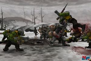 das Gebiet verteidigen bis hin zum gezielten Angriff feindlicher Gebäude gut umgesetzt. Außerdem sorgt die Erweiterung für ein frisches Spielerlebnis: Neben der Imperialen Armee wurden ja auch die vier alten Parteien um Truppen ergänzt: Für die Space Marines zieht ein griesgrämiger Ordenspriester ins Feld, der auf Distanz attackieren und in der Nähe heilen kann. Für ihre Chaos-Feinde schlägt sich der Korne Berserker als blutrünstiger Wüterich im Nahkampf. Die Orks begrüßen den Ork-Boss in Megarüstung, der quasi mit Freude Projektile schluckt und zur Killermaschine mutiert. Und auch die Eldar haben im Nahkampf Verstärkung durch die Feuerdrachen bekommen.