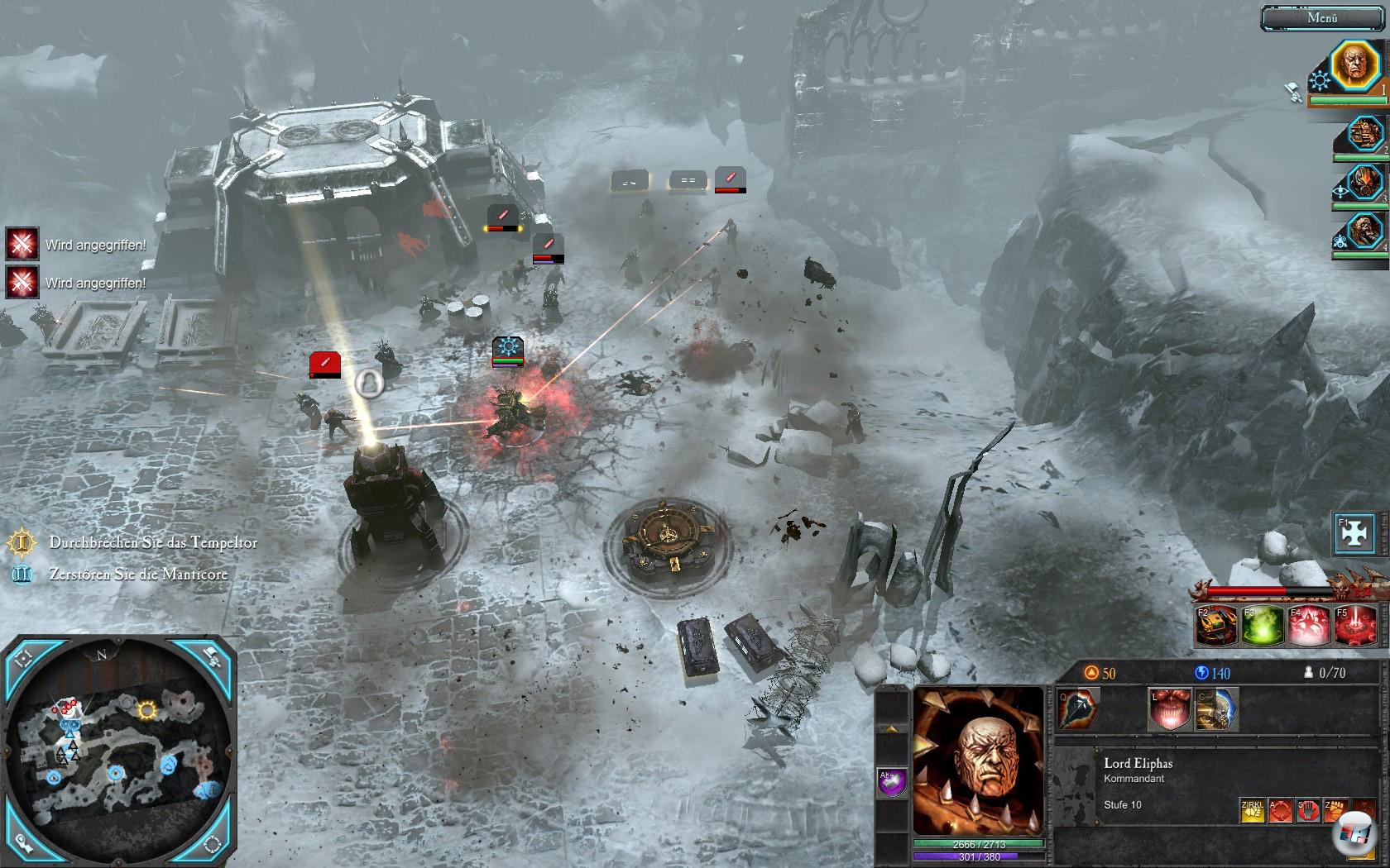 Auf den Schlachtfeldern dürft ihr weiterhin keine Basis errichten, aber zumindest neue Einheiten anfordern und so etwas wie Ressourcen einsammeln. Bei Dawn of War 2 steckten noch Granaten oder sonstiger Schnickschnack in den Kisten, jetzt lassen sich dort Anforderungspunkte oder Energie auflesen, die ihr entweder in neue Einheiten oder Verbesserungen der Helden (beschränkt auf die Mission) investieren könnt. Zudem erhaltet ihr Anforderungspunkte, Energie oder eine Anhebung des Bevölkerungslimits, wenn ihr „Kartenkontrollpunkte“ erobert. Neue Einheiten könnt ihr übrigens an solch eroberten Positionen anfordern, sofern Ressourcen und Bevölkerungslimit mitspielen.
