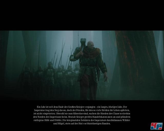 einen düsteren Wald, vorneweg ein Priester mit seinem mächtigen Kriegshammer. Irgendwann schälen sich gehörnte Helme der Chaoskrieger aus dem Nebel und ein mörderischer Kampf entbrennt in feinster Renderqualität. Blutig sackt der Priester irgendwann zusammen, ein Dämon erscheint für den Todesstoß, aber dann durchfährt den halbtoten Gläubigen die Kraft des Gottes Sigmar, sein Medaillon strahlt und sein glühender Hammer zerschmettert die schwelende Kreatur…