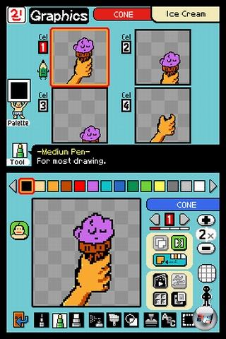Der Editor besteht aus drei Säulen: Grafik, Sound und AI (Action Instructions), wobei der Grafikabschnitt in Hintergrund und Animation unterteilt ist. Er ist auch der simpelste, denn hier kümmert man sich um den Hintergrund sowie die Spiel-Objekte, die entweder statisch oder animiert sein können – bis zu vier Animationsstufen sind pro Objekt erlaubt. Der klassische Künstler kann alles per Hand pixeln, der faule Minigamer kann auch auf etliche vorgefertigte Texturen und Stempel zurückgreifen, um sich das Designerleben etwas zu vereinfachen. Die Abteilung Sound ist schon etwas komplexer und erinnert an frühe Mod-Editoren vom Amiga oder PC: Man hat vier Tonspuren sowie einen Rhythmus-Track zur Verfügung, die man nach Belieben füllen darf. Etliche Instrumente und Geräusche stehen auf einer zwei Oktaven umfassenden Tonleiter zur Verfügung; neben Klavier, Trompete oder Gitarre warten auch Raumschiffe, Geister, Telefone oder Roboter darauf, das künftige Meisterwerk ordnungsgemäß kakophonisch zu begleiten. Wer über keinerlei musikalisches Talent verfügt, darf auch den Zufalls-Maestro anschmeißen, der entweder völlig frei oder nach einem ausgewählten Stil neue Melodien zaubert.