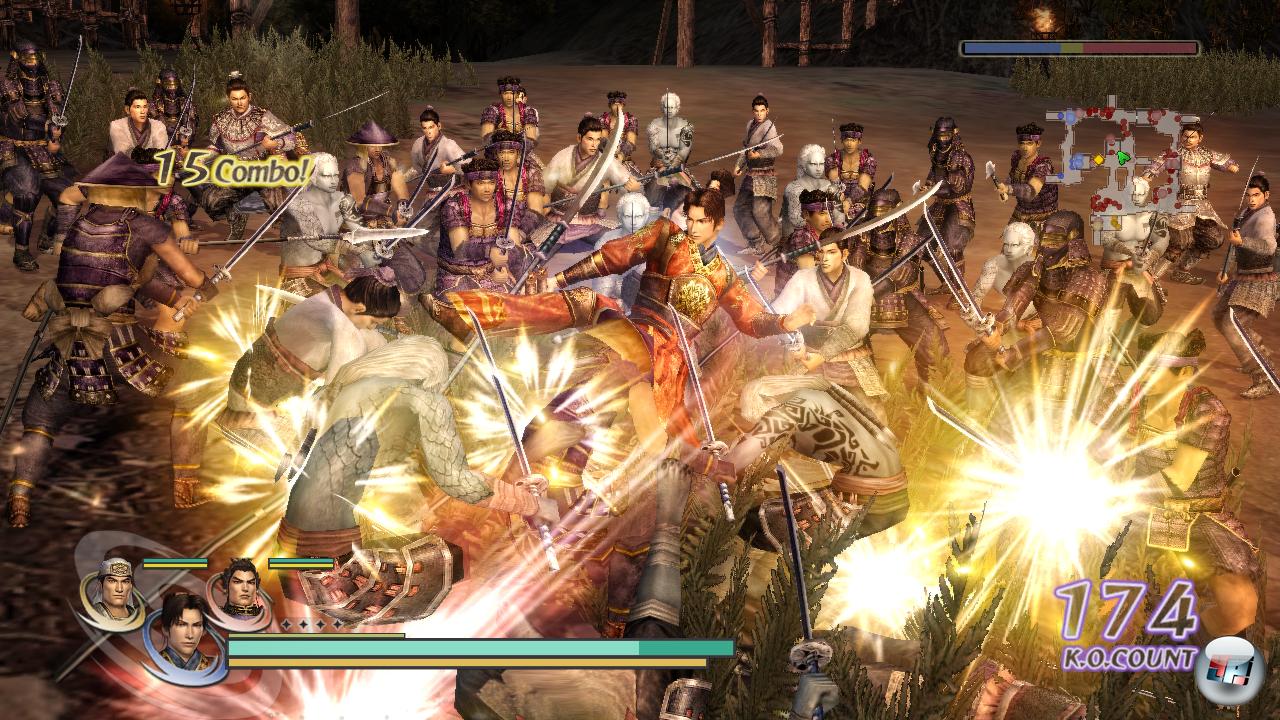 Insgesamt stehen vier Schwierigkeitsgrade zur Auswahl, wobei die Balance innerhalb der gewählten Stufe teils extremen Sprüngen unterliegt. Wer gerne zu zweit metzelt, darf sich via Splitscreen auch wieder kooperativ ans Werk machen. Der Nebel ist dann allerdings noch dichter und die Bildrate oft minutenlang auf Zeitlupenniveau, während Mobilspieler trotz zwei benötigter UMDs nur als Klontrio einzelne Schlachten über Funk bestreiten dürfen. Versus- und Online-Modi gibt es dieses Mal überhaupt keine und üppige Render-Sequenzen bekommt man auch nur noch selten zu Gesicht. Auf der PSP werden die sonst in Spielgrafik präsentierten Zwischensequenzen sogar nur in Standbildern serviert. Die teils miserabel Kollisionsabfrage, bei der man nach einem Sprung vom Pferd auch schon mal bewegungsunfähig in der Pampa verhängt, ist aber nach wie vor allgegenwärtig…