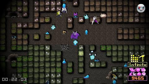 So weit, so gut. Allerdings ist der Dungeon nicht beschützt. Es gibt keine Monster, die ihn und den Bewohner Badman bewachen. Zerstört man ein mit Nährstoffen durchzogenes Feld (markiert durch grüne Bemoosung) wird ein Schleimmoos befreit, die niedrigste Lebensform in der Welt. Sie ist in erster Linie dazu da, sich auf den entstandenen Pfaden fortzubewegen (man kann sie nicht aktiv lenken oder beeinflussen) und auf ihrem Weg Nährstoffe im Dungeon zu verteilen, vergleichbar der Bestäubung, die Bienen auf ihrem Weg von Blüte zu Blüte durchführen. Haben sich auf diese anfangs willkürliche Art und Weise genügend Nährstoffe in einem Feld gesammelt, so dass es weiß wird, kann man die nächsthöhere Tierstufe „freiklopfen“, das Omnom, ein käferähnliches Lebewesen, das sich nicht nur verpuppen und in die wirkungsvollere Omnomfliege verwandeln kann, sondern auch die Grundform der Dungeonverteidigung darstellt. Sobald ein Held den Weg kreuzt, greifen die Dungeonbewohner an und kämpfen bis zum bitteren Ende.