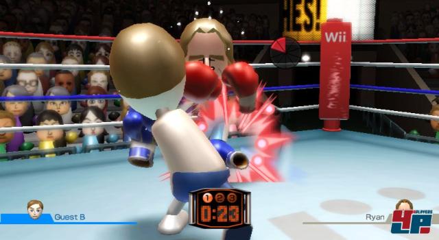 Das Boxen ist die einzige Disziplin, bei der beide Spieler jeweils eine Remote sowie die Nunchuk-Einheit in den Händen halten müssen. Haltet ihr beide Teile direkt vor euren Körper, zieht ihr damit eure Deckung nach oben und wehrt Schläge ab. Um selbst kräftig auszuteilen, bewegt ihr Fernbedienung und Nunchuk für Kopfschläge einfach gerade zum Fernseher hin oder schlagt diagonal nach unten, um den Körper zu attackieren. Allein durch eure Körperbewegungen zur Seite sowie nach hinten weicht ihr den Angriffen aus, wobei ihr euren Mii immer als Ghost auf dem Bildschirm