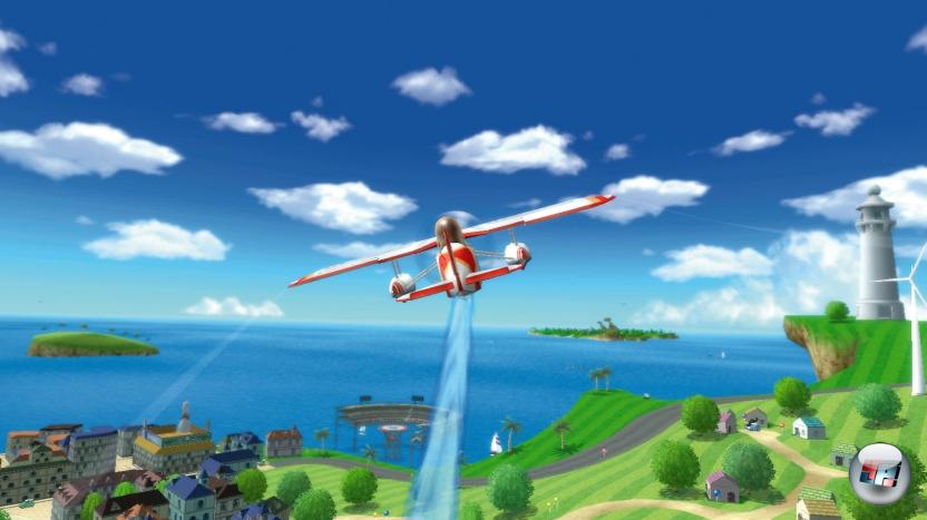 In einer davon darf mich sogar in ein kleines Propellerflugzeug schwingen, mir alle Sportstätten aus der Luft anschauen und das Eiland nach versteckten Orten absuchen. Oder ich ballere unserem Video-Redakteur Dieter im unübersichtlichen Splitscreen-Duell die Ballons vom Heck. Der Flieger lässt sich intuitiv steuern: Er bewegt sich stets in die Richtung, in die ich meine Fernbedienung richte – dank der Technik lassen sich kinderleicht kleine Loopings und Schrauben ausführen.