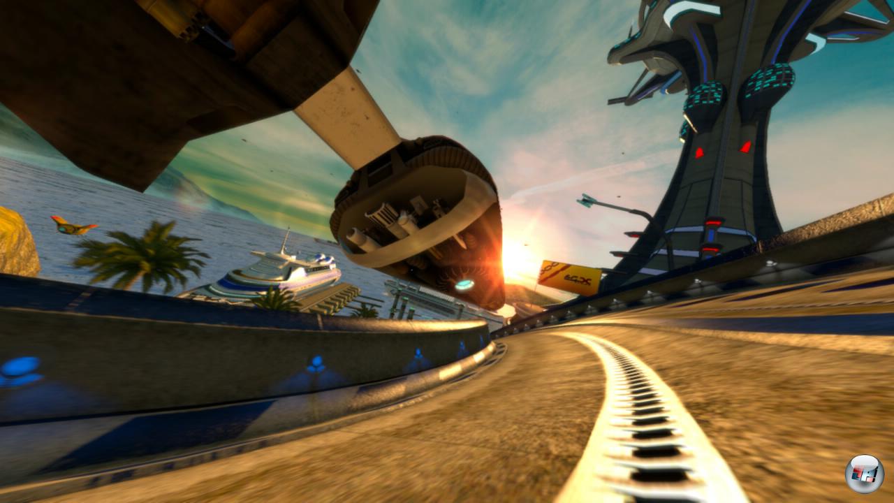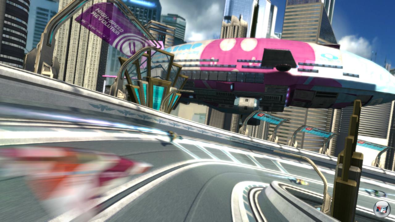 Und bei all der Meckerei muss ich ja eingestehen, dass diese Sucht mit HD sogar eine neue Qualität gewinnt. Schuld sind die etlichen kleinen Verbesserungen, an denen man sieht, dass den Leuten in Liverpool ihr Baby wohl doch am Herzen liegen muss. Da geht’s nicht um die herausragende visuelle Brillanz oder in 5.1 abgemischtes Elektro-Hämmern. Da geht’s darum, dass die Wettläufe knackiger werden, weil jetzt wesentlich häufiger ein „Contender Eliminated“ von einer Totalverschrottung zeugt – die dann zum ersten Mal den Rest des Rennes den Rand der Flugbahn ziert. Oder darum, dass die Musik zu Beginn eines Rennens endlich dort weiter macht, wo sie zum vergangenen Rennende gestoppt wurde – das funktioniert sogar nach einem Neustart des Spiels. Es geht auch darum, dass jeder seine eigene Musik einbinden darf – dabei werden sogar die unterschiedlichen Lautstärkepegel solcher Dateien auf das Spielniveau angeglichen. Es geht darum, dass der erst in Pulse vorgestellte „Elektrokäfig“, der die Flieger nicht über den Streckenrand fallen ließ, wieder „abgeschraubt“ wurde – viel Spaß beim Aufspüren von Abkürzungen! Und es geht darum, dass jeder Online-Raser vor dem Start eines Turnierlaufs entsprechend seiner Platzierung an den Start gestellt wird – die Schnellsten kommen so nach hinten; die Langsamen dürfen nicht mehr über Benachteiligung meckern.