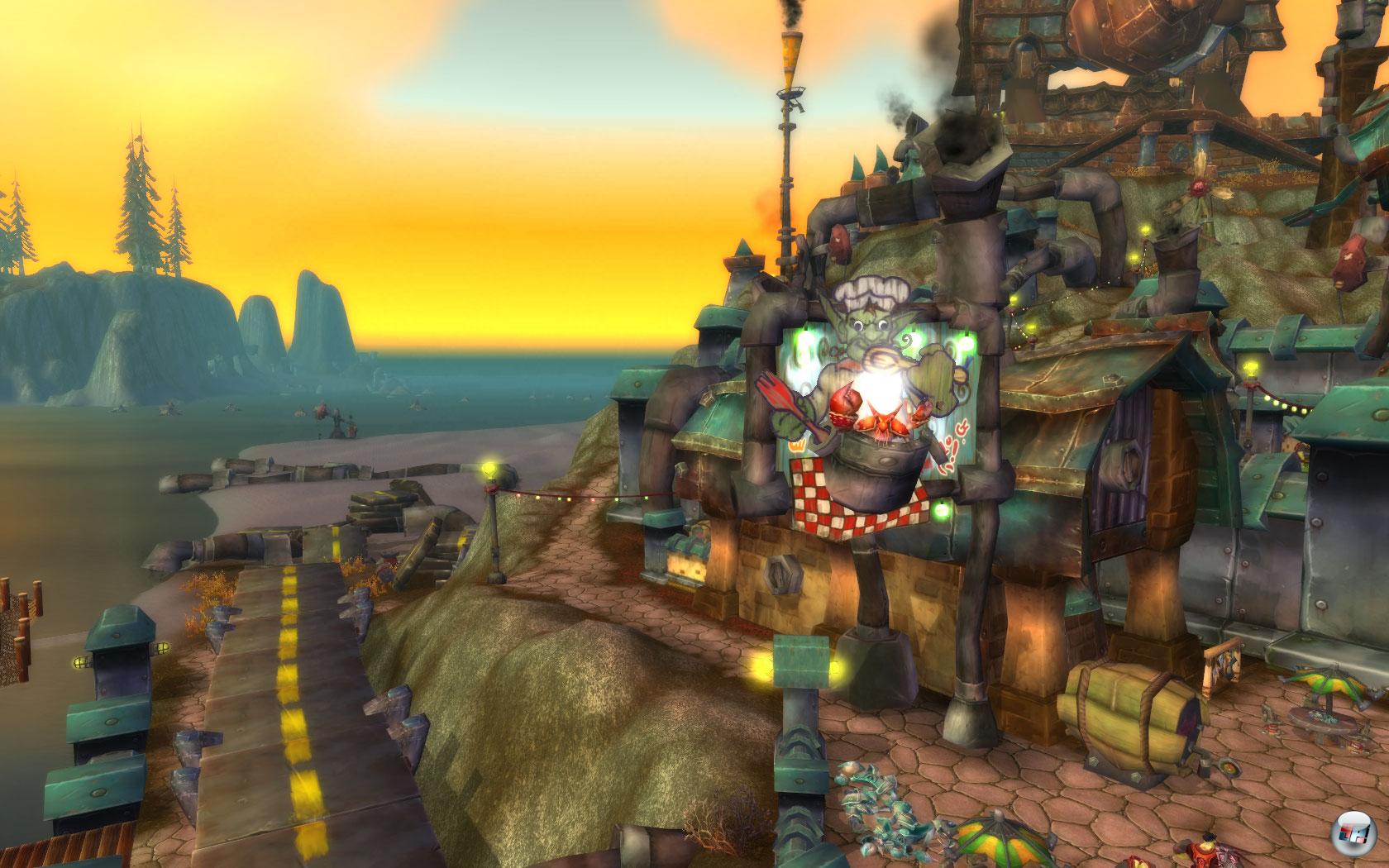 | In Aszhara haben die Goblins eine große und sehr chaotische/bunte Stadt hochgezogen (sogar mit bewegten „Werbetafeln“). |