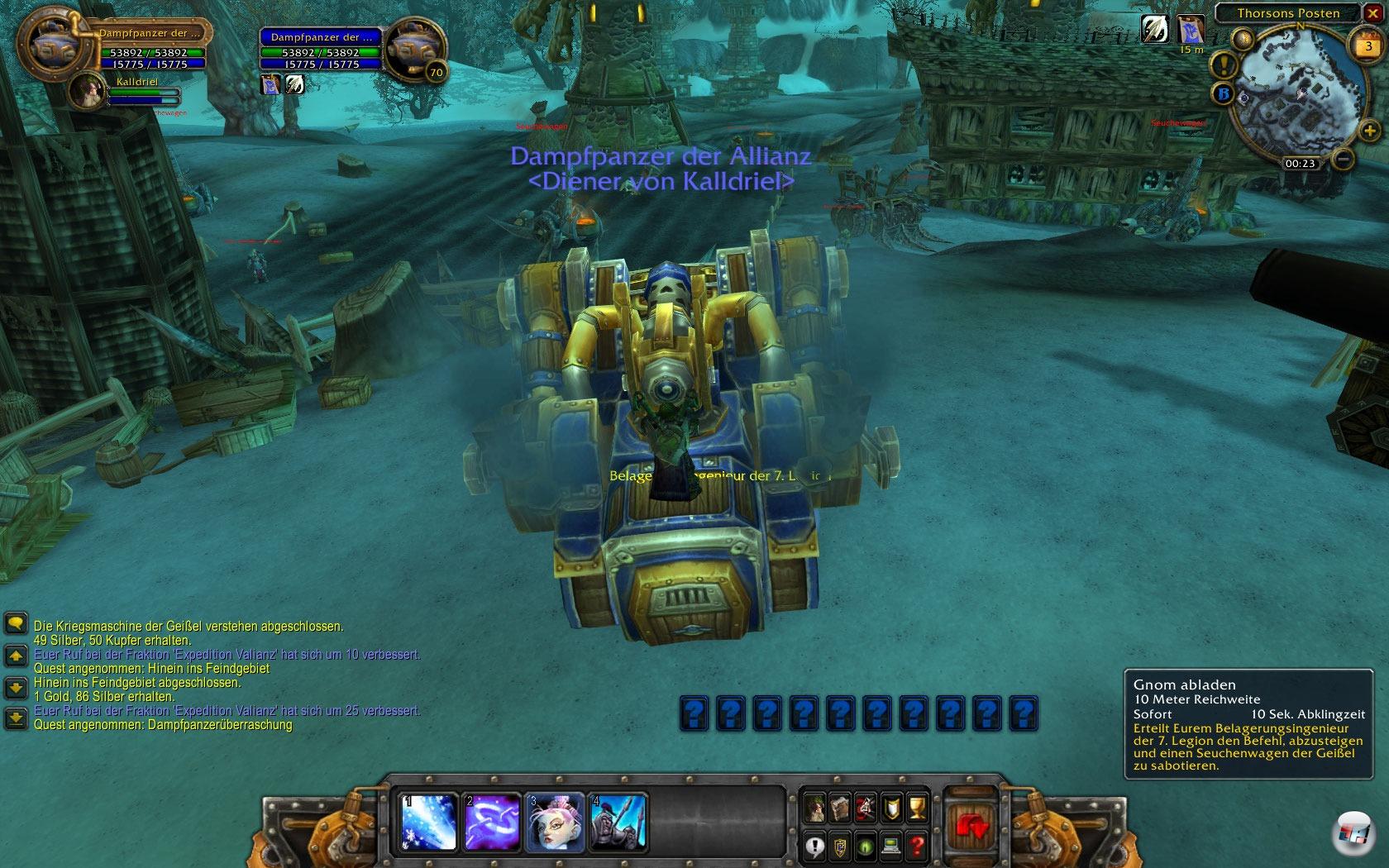 Im Rahmen der Quest-Aufgaben müsst ihr auffallend oft zur Verfügung gestellte Gegenstände an bestimmten Stellen oder bei gewissen Gegnern einsetzen (vergleichbar Insel von Quel’Danas), besonders imposant ist eine Sturmgipfel-Quest, bei der ihr mit einer Harpune von fliegendem Drache zu Drache hechtet und deren Reiter ausschaltet. Häufig dürft ihr Fahrzeuge, Standgeschütze oder völlig andere Figuren (Geister, Ghule, „bekannte Persönlichkeiten“, etc.) steuern, um mit ihnen Aufgaben zu erfüllen. Als Dampfpanzer-Fahrer müsst ihr Geißel-Katapulte ausschalten und anschließend mit einer Schnellfeuerkanone fliehenden NPCs solange Deckung geben, bis sie in Sicherheit sind. Erkundungs-, Eskort- oder Transport-Aufgaben runden die Palette ab. Irgendwie hat man in den meist kampfbetonten Quests das Gefühl einen mächtigen Charakter zu spielen und niemanden, der auf Stufe 72 Ratten oder ähnlich Lächerliches töten muss. Auch die Anzahl an Gegnern, der man mit Fahrzeugen, Flugzeugen oder Drachen entgegen tritt, ist wesentlich größer