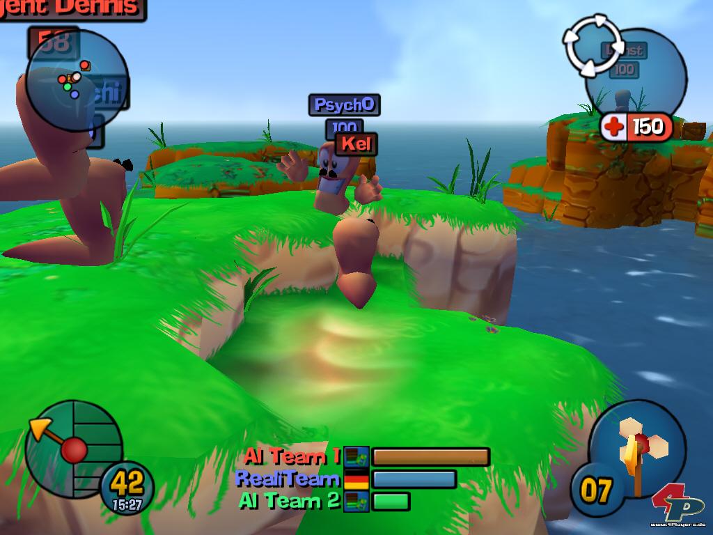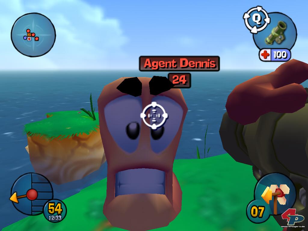Durch den Zugewinn einer Dimension muss sich der Spieler natürlich einige Änderungen in der Art und Weise des Zielens abfinden. Während ihr früher einfach unter Berücksichtigung des Windes Winkel und Stärke eures Geschosses eingestellt und abgedrückt habt, müsst ihr jetzt auch noch mit dem dritten Raum hantieren – inklusive Höhenstufen und schwer einschätzbarer Entfernung. Zwar ist es theoretisch möglich, wie gehabt zu spielen, in der Praxis müsst ihr jedoch ständig in die Ego-Ansicht oder Vogelperspektive schalten, um vernünftig zielen zu können. Nichtsdestotrotz ist ein gut platzierter Schuss zumindest anfangs größtenteils Glückssache, das richtige Gefühl für Entfernung und Winkel setzt sich erst mit der Zeit ein. Das Gewöhnungsbedürftigste der neu gewonnenen Dimension ist allerdings die Sprungsteuerung: Da die Sprungweite nur sehr schwer abzuschätzen ist, landen viele gut gemeinte Hopser im Wasser oder in einem Krater, wo das Sprungproblem mit einer schlechten Perspektive eine unheilige Allianz eingeht und den Spieler des Öfteren verzweifeln lässt. Aber es gibt auch Positives von der Sprungfront zu berichten: Ihr dürft die Würmer jetzt im Flug leicht nach links oder rechts steuern, außerdem beherrschen eure Viecher einen praktischen Doppelhopser, mit dem sich höher gelegene Plattformen erreichen lassen.