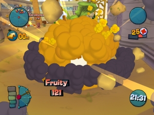 aufplusternden Explosionen mit jeder Menge Comic-Rauch sorgen für ein fröhliches Spielergesicht, welches durch die Akustik nochmals in die Breite gezogen wird: Abgefahrene Stimmchen in mehreren Sprachen, zackige Effekte und angenehm zurückhaltende, aber dennoch gut klingende Musik sorgen für schöne Atmosphäre.Zwei der größten Probleme der Worms-Post-2D-Ära waren Kamera- und Wurmsteuerung. Und speziell ersteres hat Team 17 auch mit dem siebten Teil nicht im Griff: Steht ihr in der Nähe von Gebäuden, dreht die Ansicht schon mal (wörtlich gesprochen) völlig durch, Nachkorrigieren ist in solchen Fällen kaum drin, Blindschüsse und –sprünge damit unvermeidlich. Generell lassen sich Hopser nach wie vor kaum einschätzen, so dass gezielte Sprünge auch Glückssache sind – immerhin dürft ihr den Flug eures Wurms in der Luft noch leicht nach links und rechts korrigieren. Neu auf dem Schlachtfeld sind ferner Schnellteleporter, mit denen ihr euch zwischen einzelnen Punkten auf der Karte hin- und herbeamen dürft.