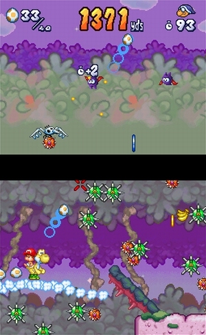 Der Beginn einer wundervollen Freundschaft Der Nachteil ungelernter Arbeitskräfte: Der trottelige Klapperstorch verliert Baby Mario, welcher an drei Luftballons gen Erde segelt. Eure Aufgabe ist es nun, ihn sicher durch die gefährlichen Lüfte zu geleiten, damit er unten sicher auf Yoshis grünem Rücken landen kann. Dazu malt ihr einfach mit dem Stylus Striche auf das Touchpad, welche auf dem Screen kleine Wolken bilden und Baby Mario auf den richtigen Weg leiten. Natürlich wäre das so viel zu einfach, weswegen beim Fall nicht nur wertvolle Münzen in der Luft schweben, die man tunlichst aufsammeln sollte, sondern auch Gegner – denen man entweder ausweichen oder sie einfangen kann. Unten angekommen wird aus dem Vertikal- ein Horizontalscroller: Auf Yoshis Rücken trabt ihr dem verträumten Storch entgegen, sammelt mehr Münzen, überwindet Abgründe und entledigt euch zahlreicher Gegner – entweder per Einkreiselung oder gezieltem Eierwurf. All das wird euch vor Spielbeginn in einem süßen Tutorial beigebracht. Seid ihr beim Storch angekommen, ist ein Eintrag in die Highscore-Liste fällig, danach geht es zurück zum Hauptmenü – das war nämlich im Wesentlichen das ganze Spiel! Zu zweit auf der Insel Neben dem normalen Spielmodus warten noch drei Varianten auf euch, die teilweise erst freizuspielen sind: Der »Marathon« ist eine Art Endlos-Gelaufe mit immer neuen Levels, bei dem die geschafften Meter in Punkte umgerechnet werden. In der »Time Attack« sorgt ein mittickendes Zeitlimit für Hektik und der »Challenge Modus« schließlich ist eine Mischung aus allen Varianten. Bleibt nur noch das Mehrspielervergnügen, dem sich zwei Spieler hingeben dürfen, wobei nur ein Spielmodul benötigt wird: ein witziges Wettrennen, bei dem man auf dem oberen Screen den Gegner und unten sich selbst sieht. Optisch erinnert Yoshi Touch & Go ein wenig an den SNES-Klassiker »Yoshi’s Island«: knuffige Figuren, niedliche Animationen, komplett in 2D ohne spezielle Effekte. Dazu gibt es beschwingte Pfeif-Musik, niedliche Effekte sowie etwas Baby-Geschrei seitens Mario – auf Wunsch auch in virtuellem Surround-Klang. | Fakten: – wird mit Stylus gesteuert Pro / Kontra: + einfache Steuerung – im Grunde nur zwei Spielelemente