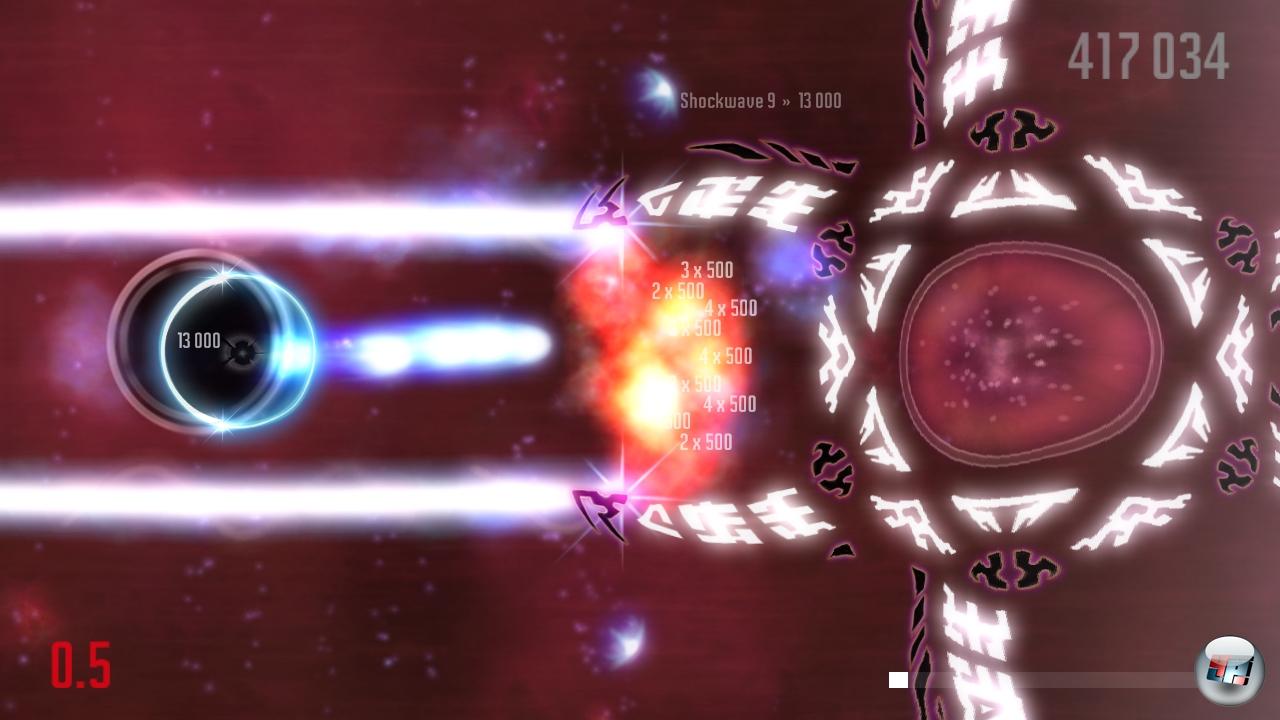 Schatten acht Mal beschießt, wird eine Druckwelle erzeugt – reißt die möglichst viele Gegner mit sich, gibt’s Extrazähler. Benutzt man den »schnellen Vorlauf«, rauschen die Gegner schneller heran – aber geben auch mehr Punkte. Kombiniert man spezielle Aktionen (wie eine perfekte Zeitreise und eine Schockwelle) – nun, ihr ahnt es. Das normale Dauerfeuer wird nach kurzer Zeit automatisch aufgerüstet, dann gibt es schnellere Schüsse, Laser oder einen Kettenblitz – auch diese lassen sich in Zusammenarbeit mit dem Schatten für höhere Punktzahlen einsetzen.![]()