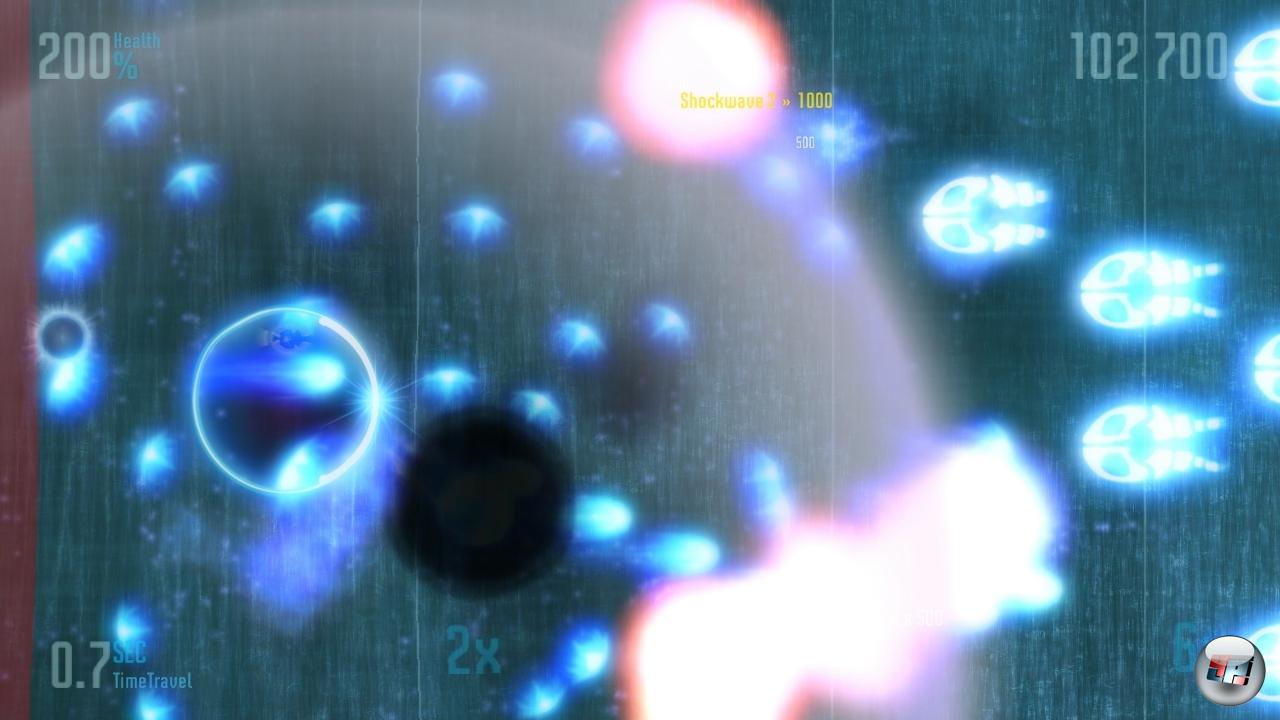 Man merkt schon: Zeit² ist ein reiner Highscore-Shooter – neben der Jagd nach der möglichst hohen Punktezahl sowie dem damit verbundenen Ruhm auf der Freundesliste gibt es keine weitere Motivation. Kein Wunder also, dass es sehr viele Möglichkeiten gibt, den eigenen Score beeindruckend hochzukurbeln: Es gibt Bonuspunkte, wenn man eine Zeitreise an genau der gleichen Stelle beendet wie der Schatten. Wenn man den